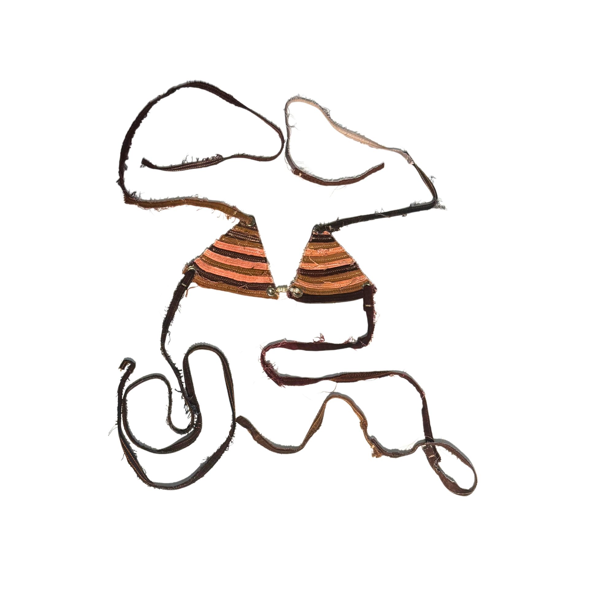 Construction: For the top, I used flatfeld seams from the inseam of used jeans, carefully bleached and dyed them to achieve a beautiful brown and rust ombre, then sewed them on the custom top pattern pieces, adding grommets for the straps (which are also made from flatfeld seams). As for the bottom, I used a secret ombre dying technique to give the skirt some texture, then sewed additional flatfeld seams onto a pair of used jeans that I turned into a skirt.