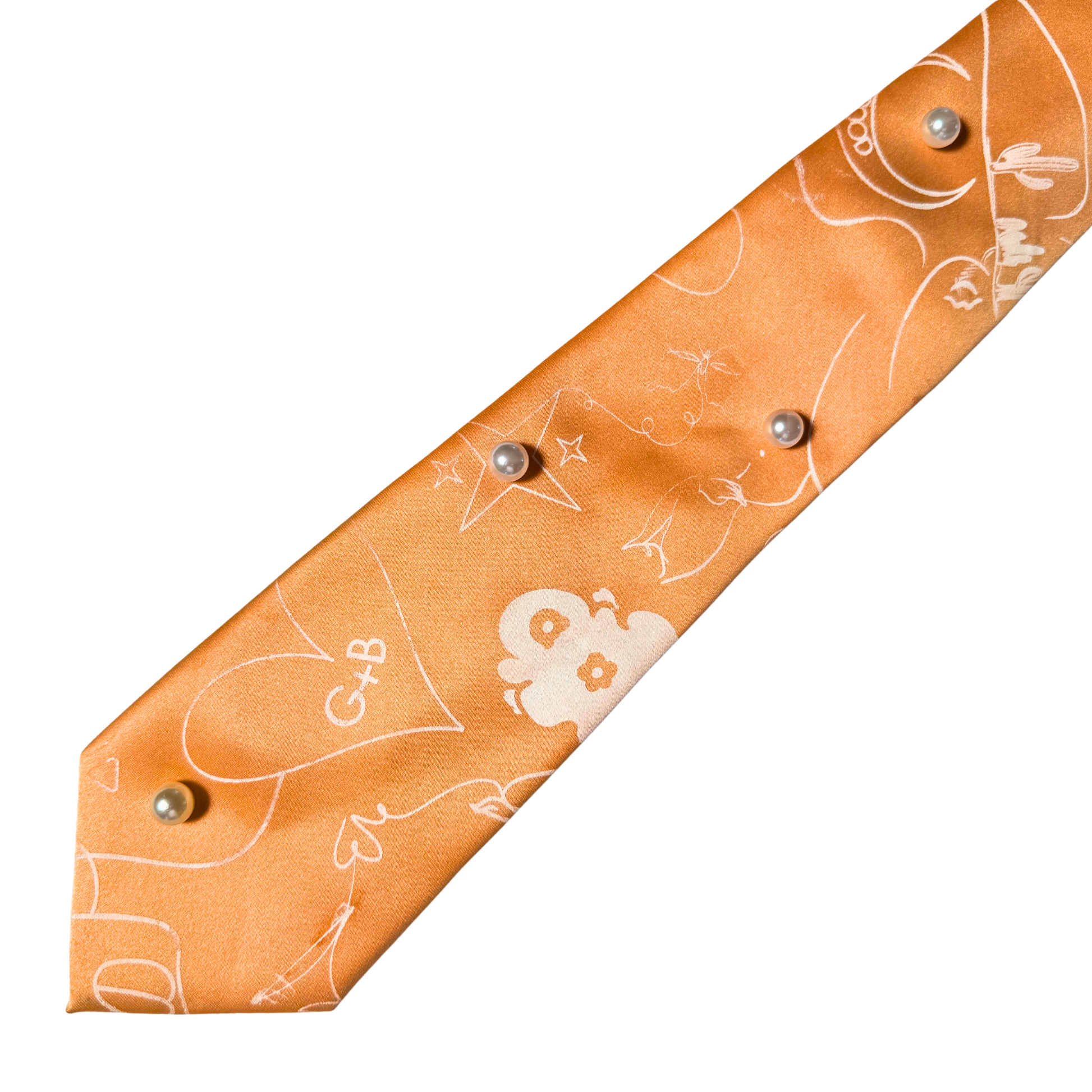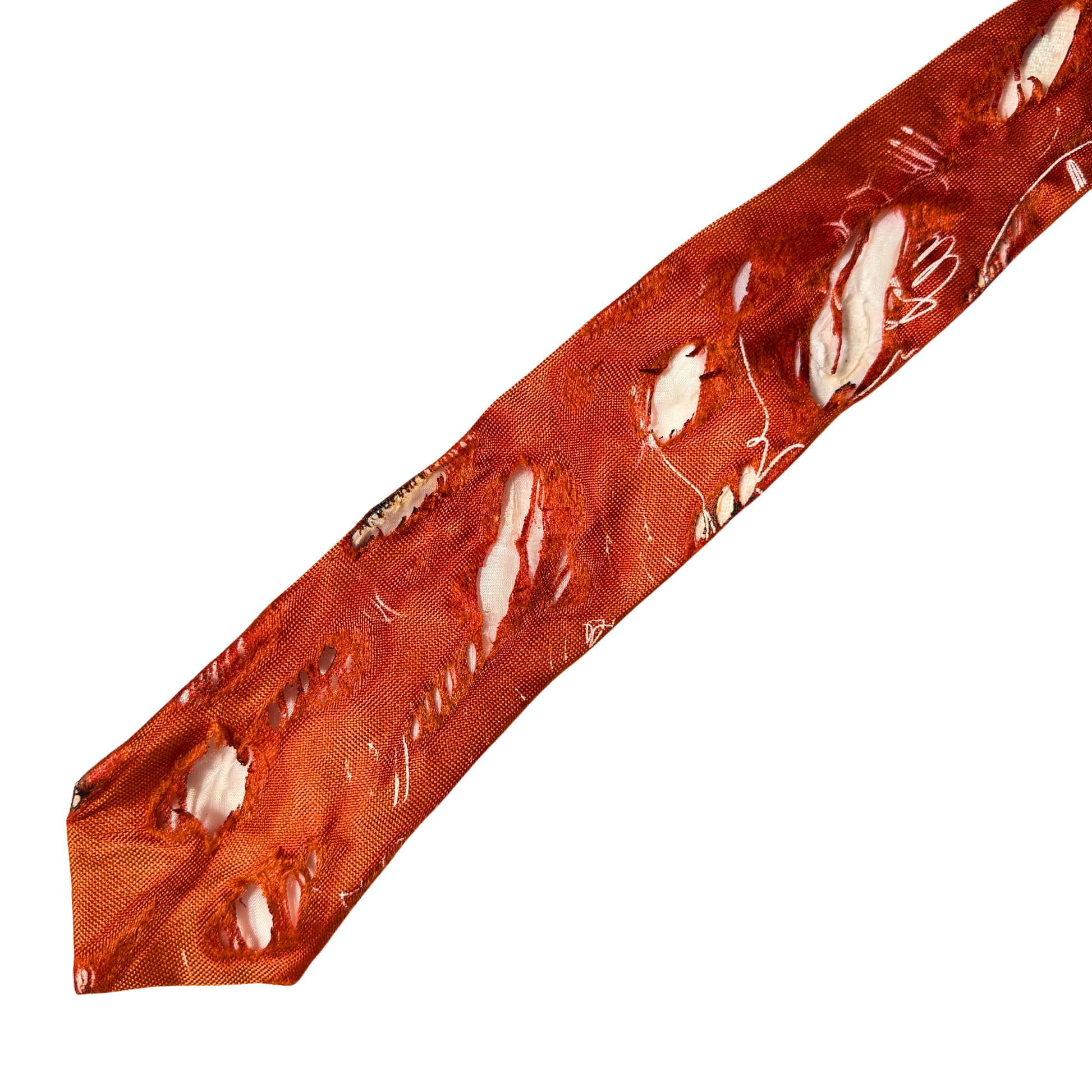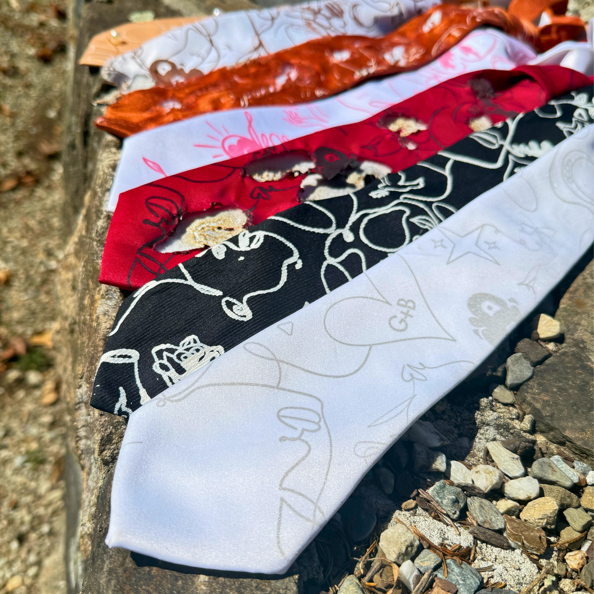 A variety of colorful ties covered in a lineart print. Some are burnt, some heave pearls