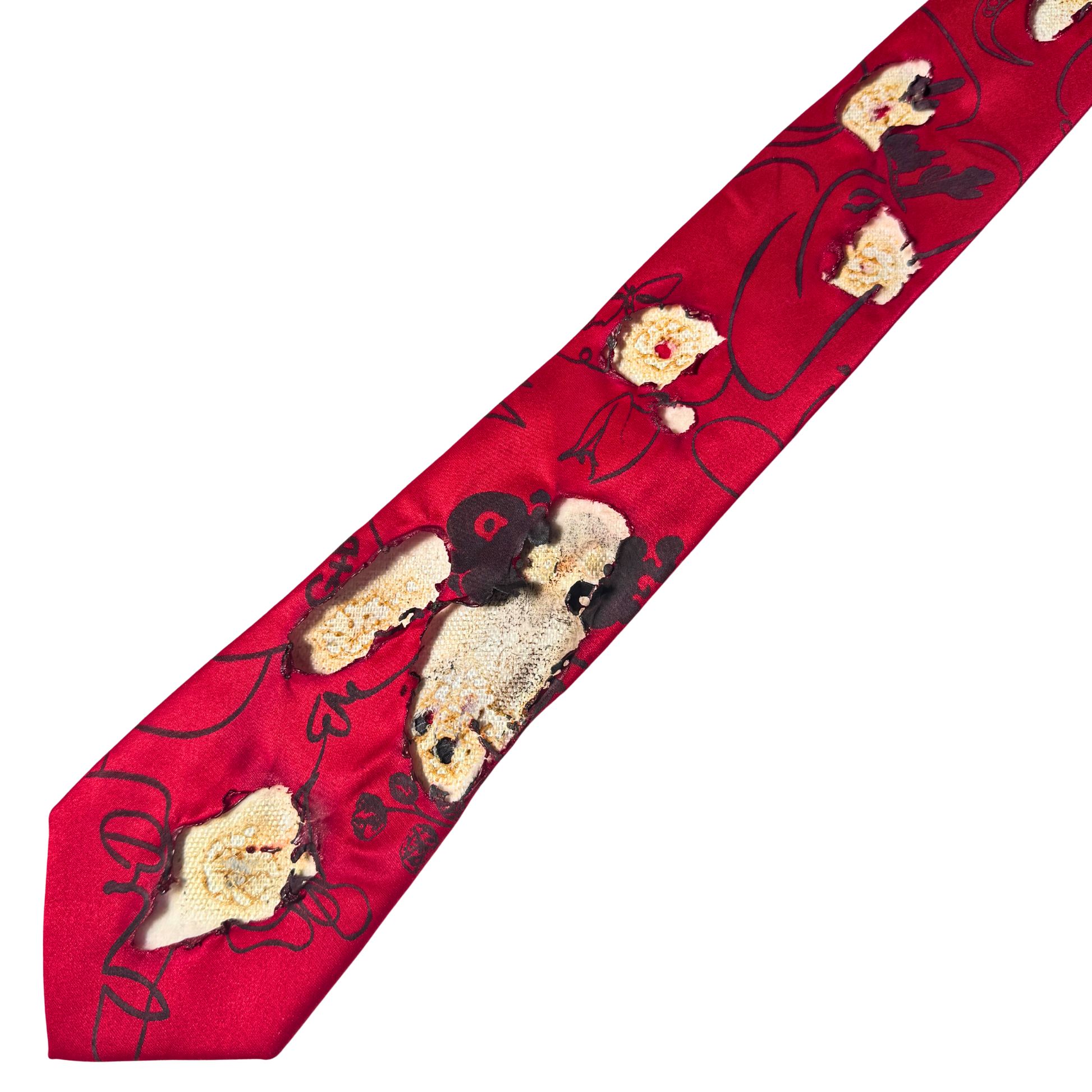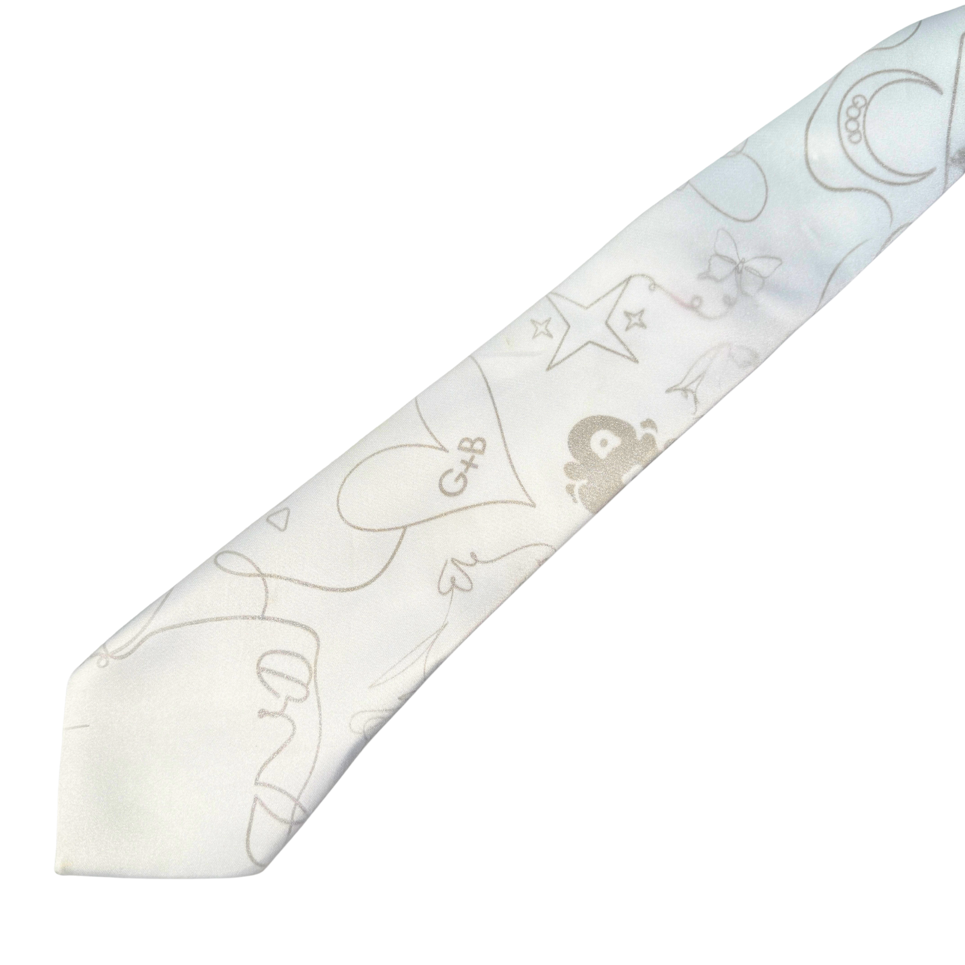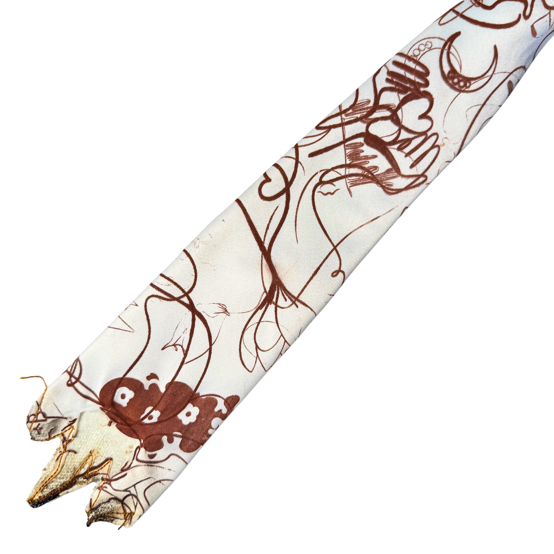 A variety of colorful ties covered in a lineart print. Some are burnt, some heave pearls