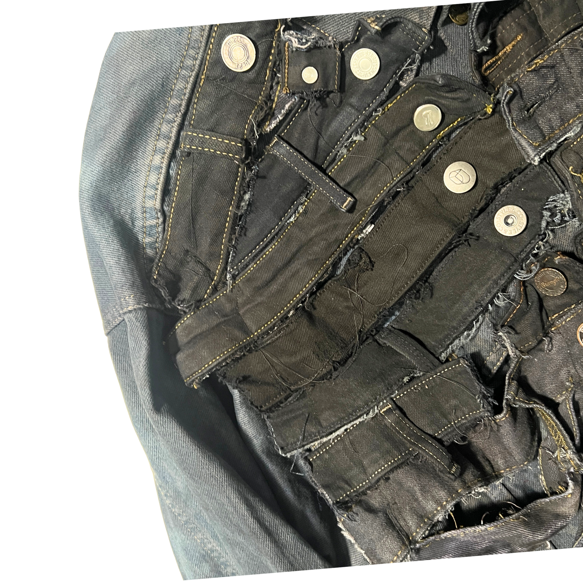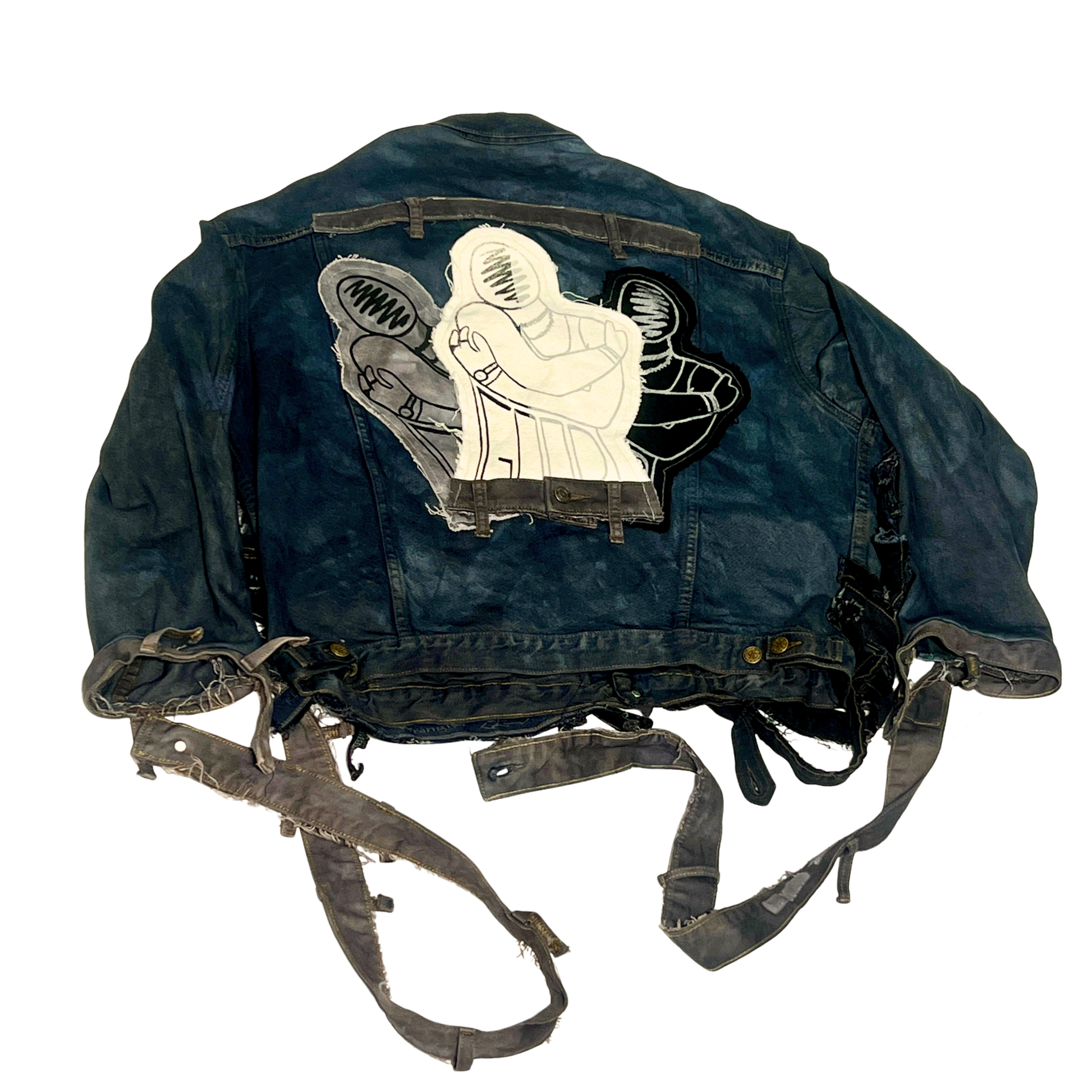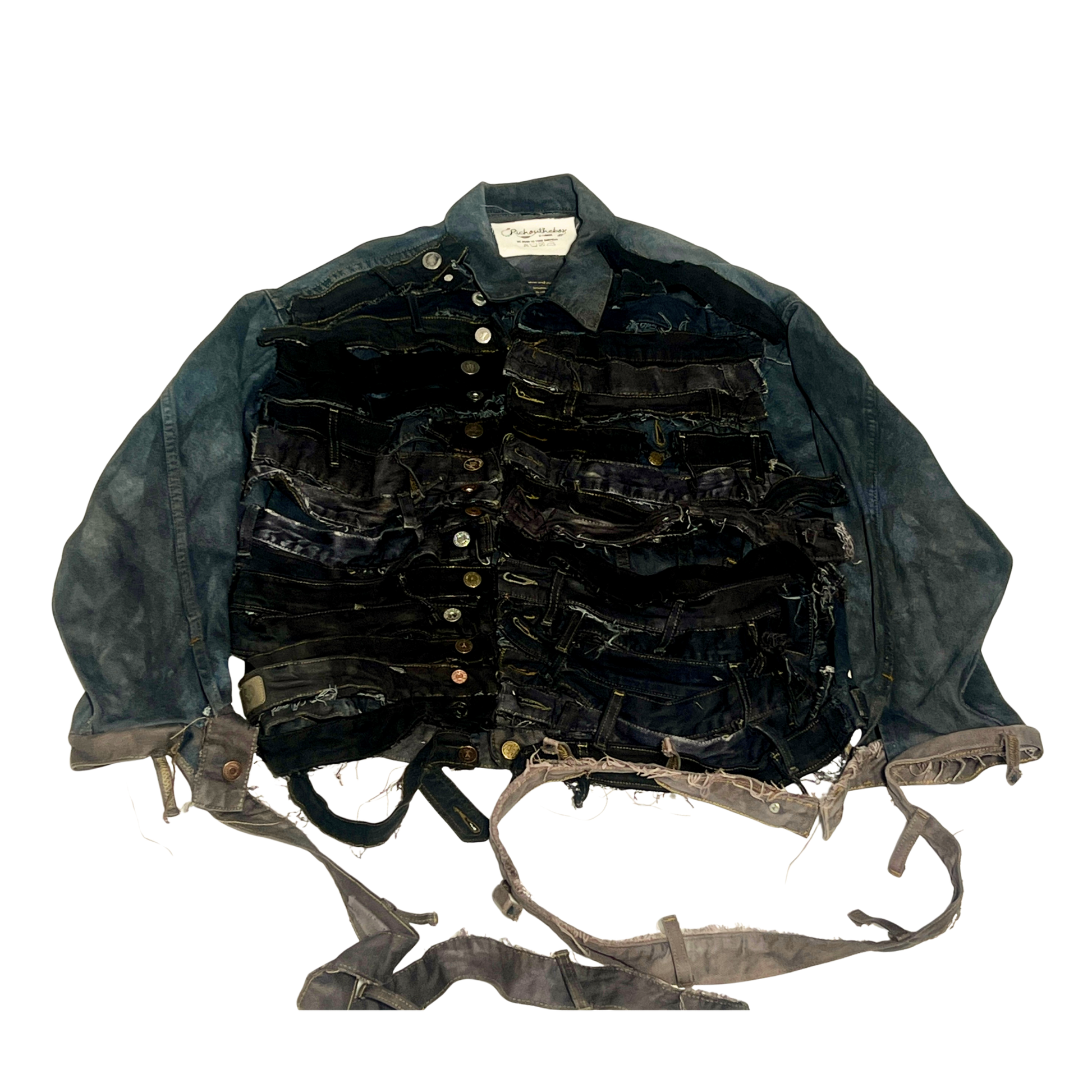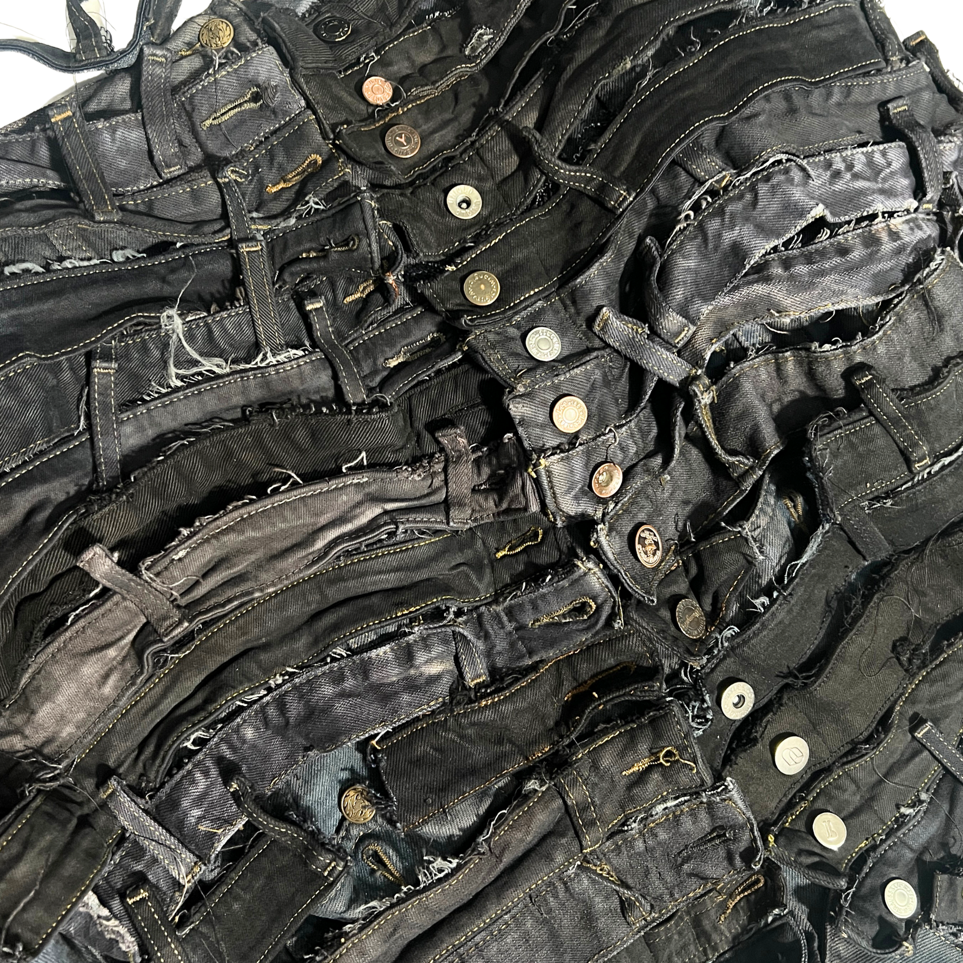 Process: I started by removing the waistbands from 30 thrifted jeans, then carefully bleeched them, pinned them to the garment, and sewed (for days). The construction process took 8 needles and 50 hours.