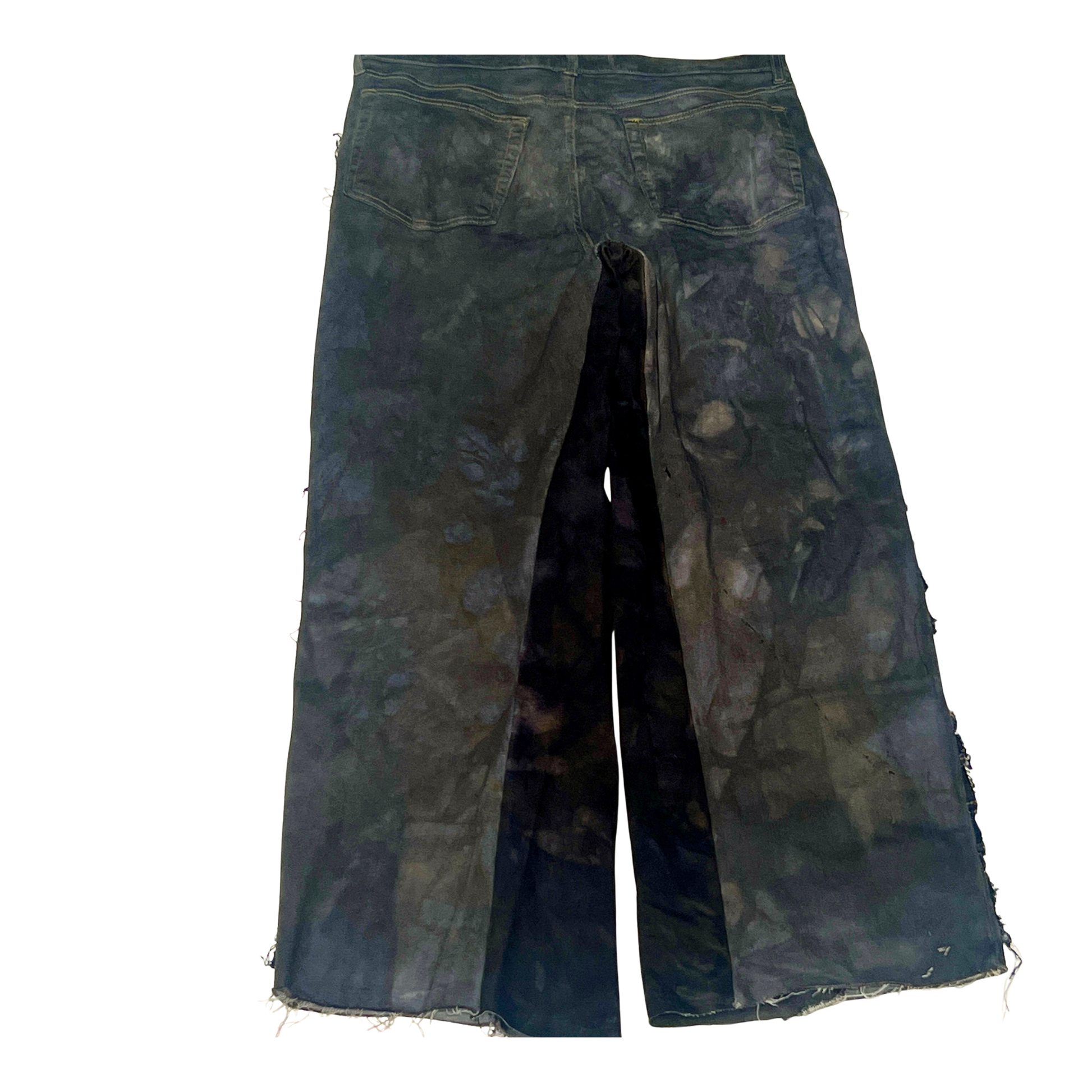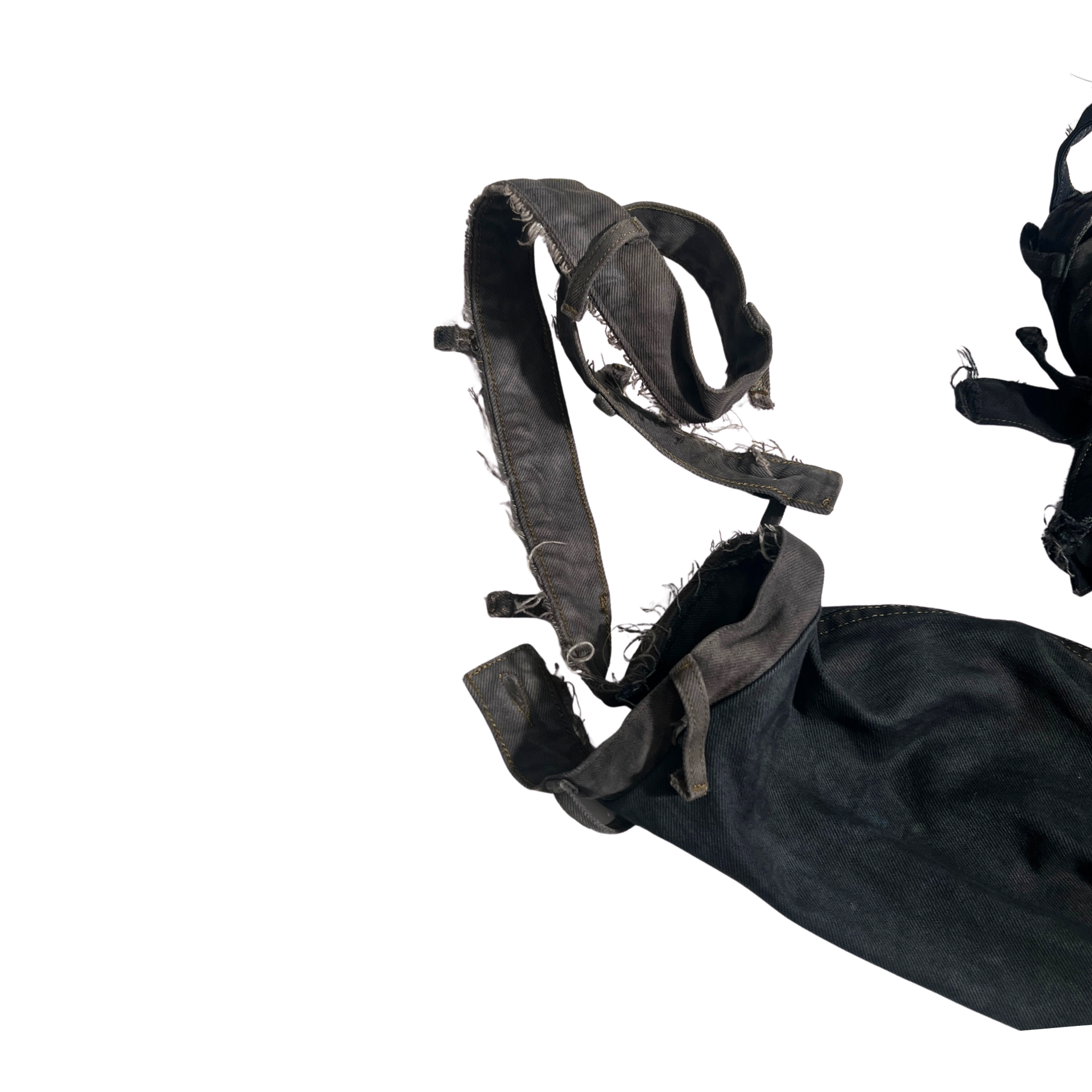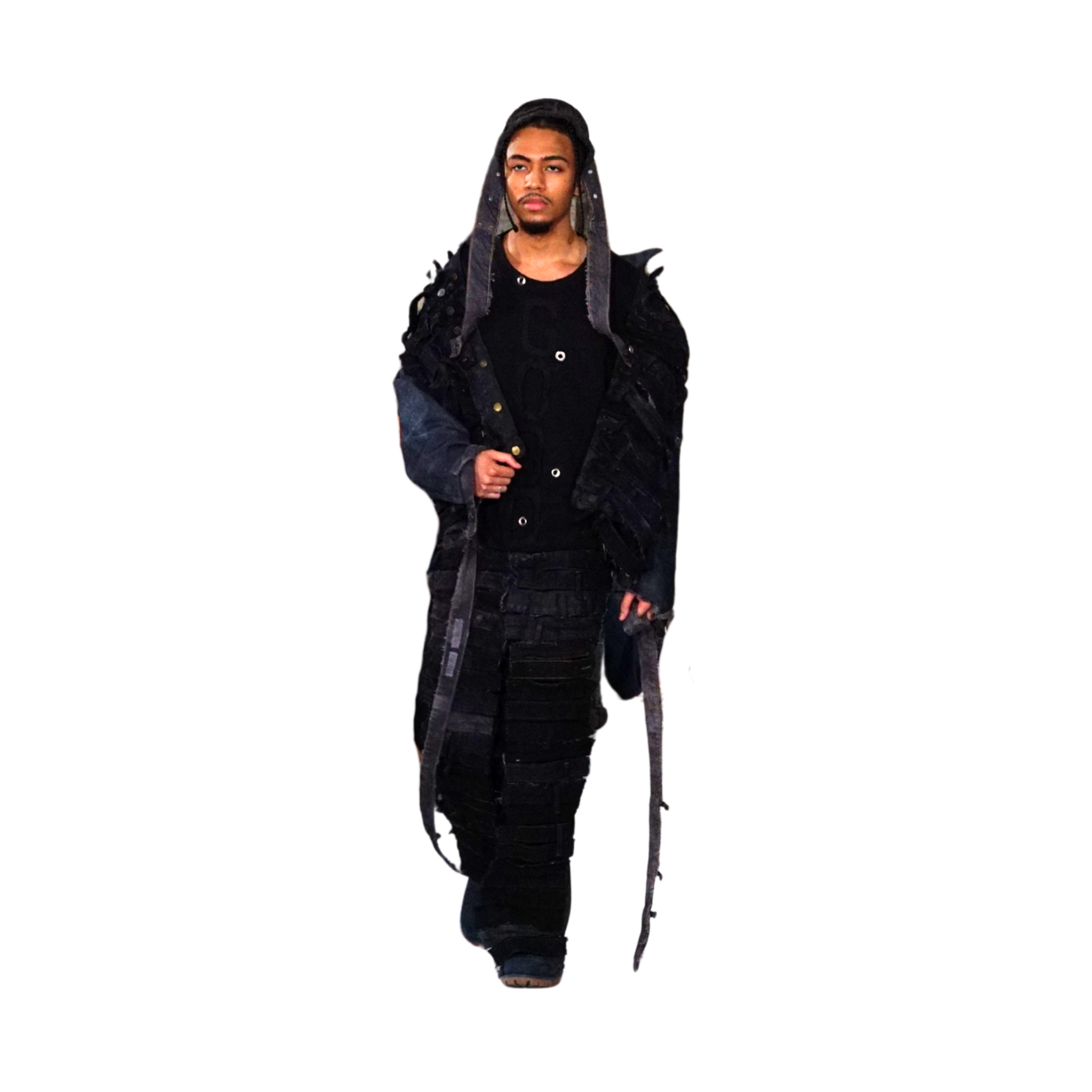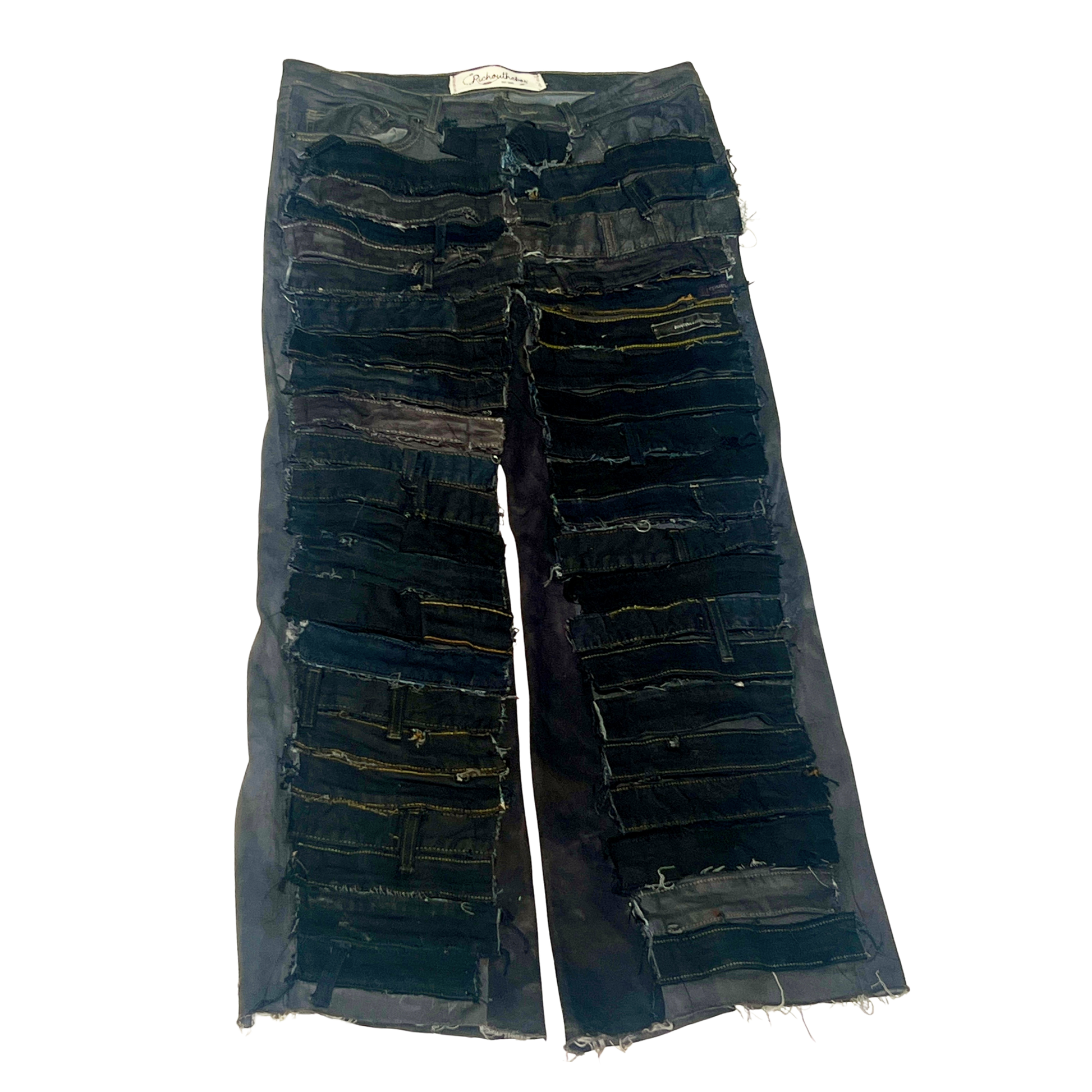 Process: I started by removing the waistbands from 30 thrifted jeans, then carefully bleeched them, pinned them to the garment, and sewed (for days). The construction process took 8 needles and 50 hours.