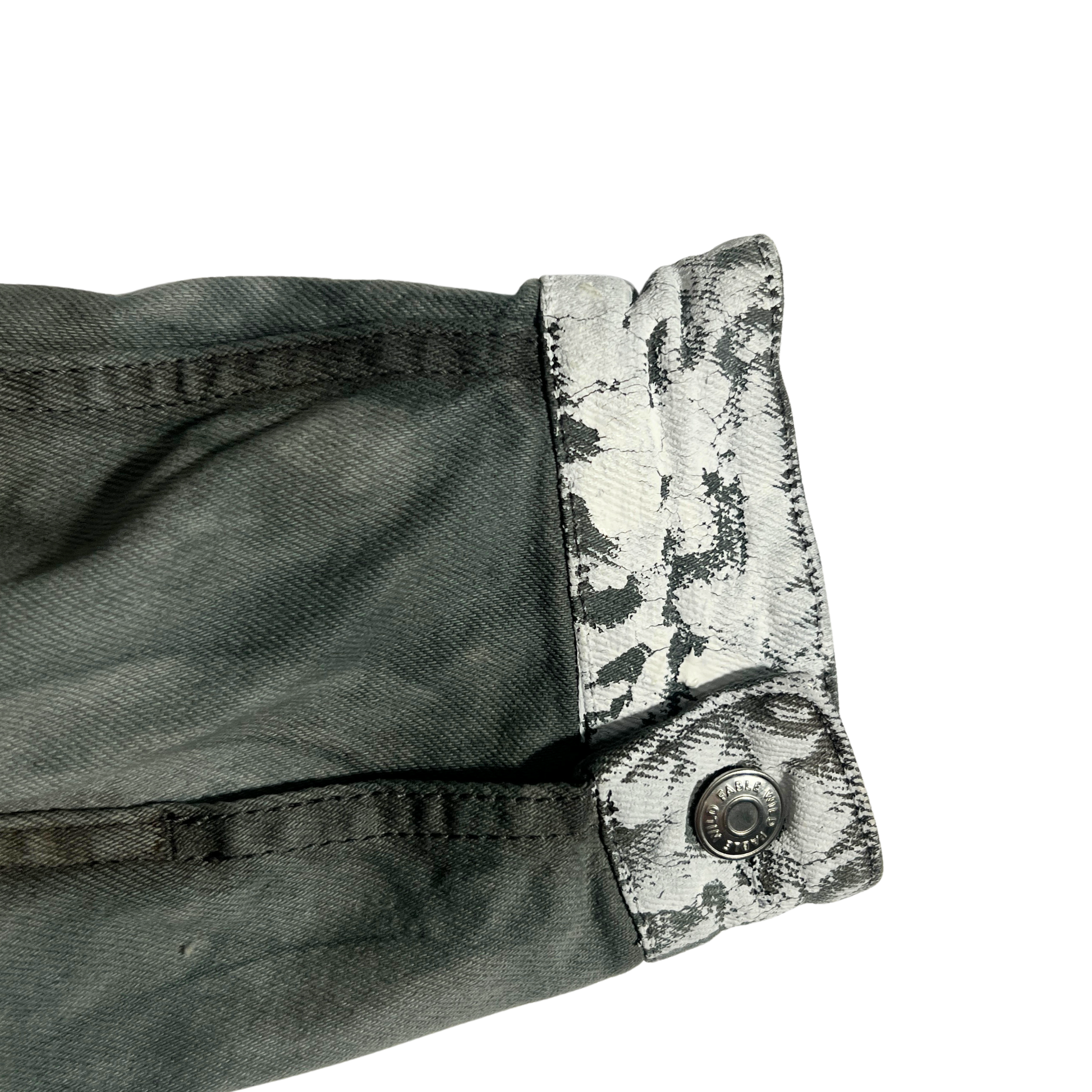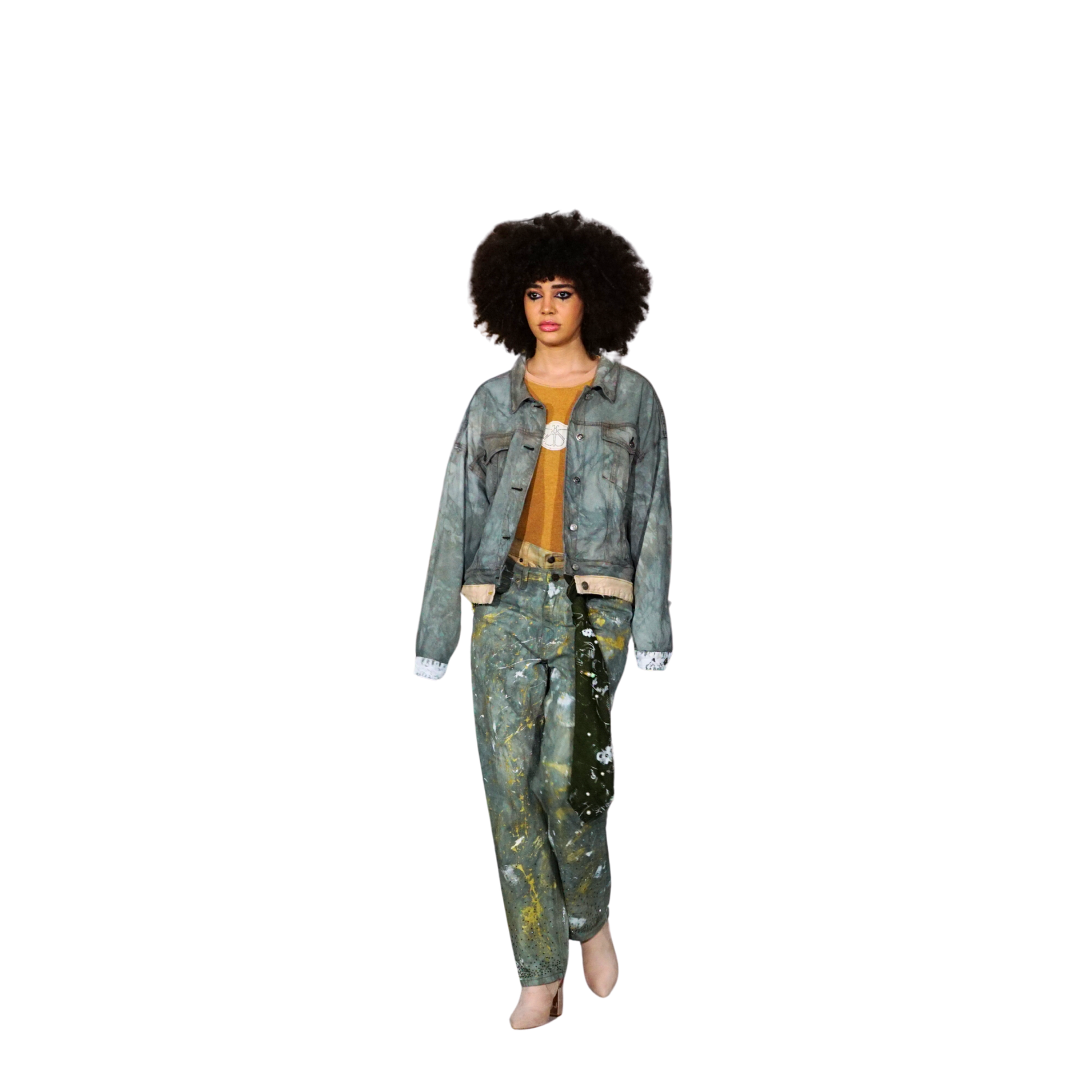 This hand-altered denim set is a wearable reflection of modern identity. The jacket features a textured splotchy dye base, an offset double hem, and a rhinestone-covered face print — distorted to symbolize the pressure of always presenting a perfect image. White ink accents on the cuffs mirror the splattered paint and scattered rhinestones that climb the custom double-waisted jeans.