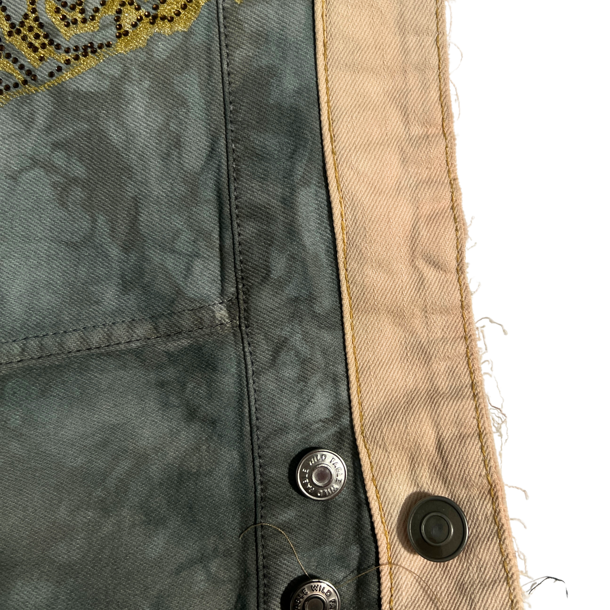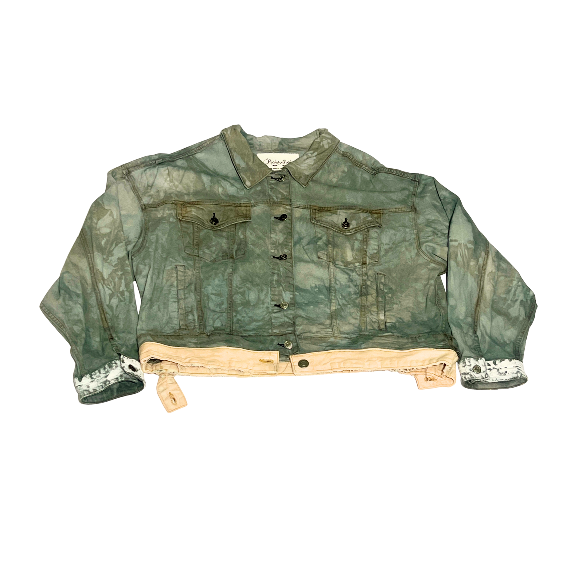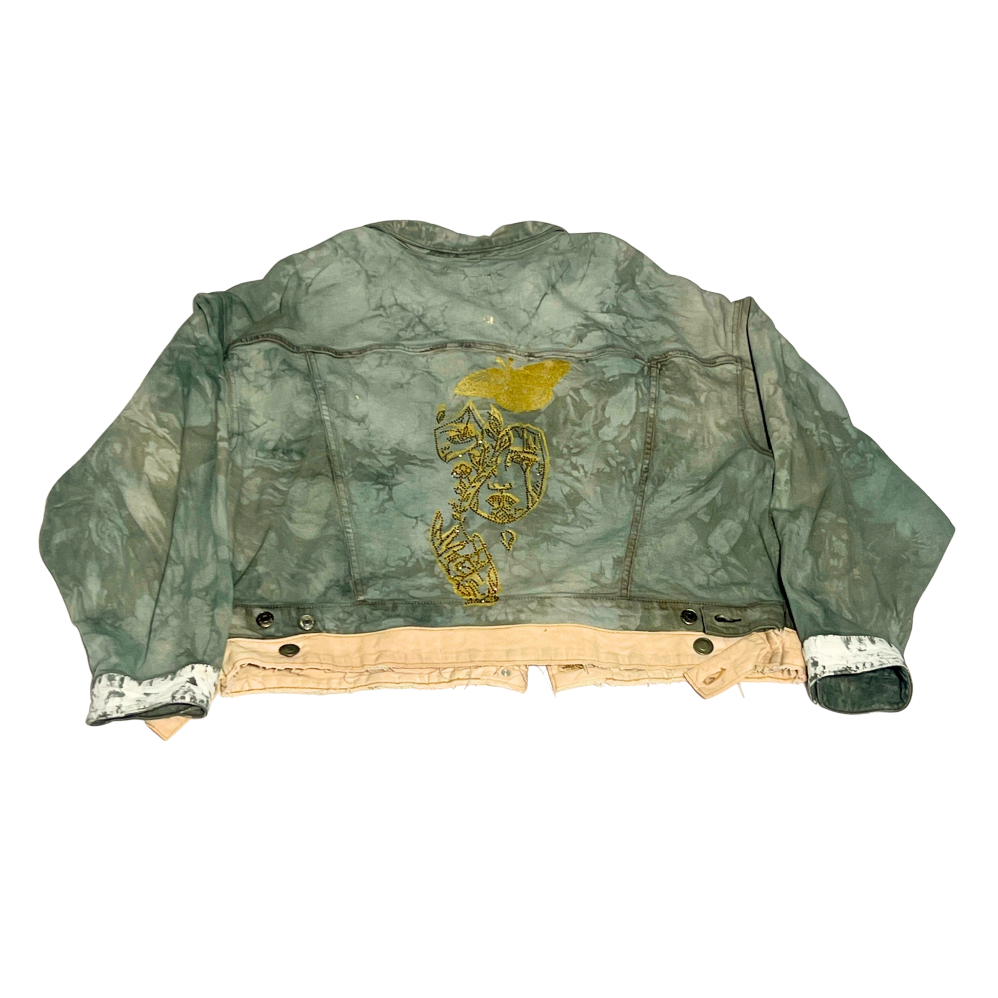 Jacket: Hand-dyed with offset double hem, rhinestone face print, white ink cuffs