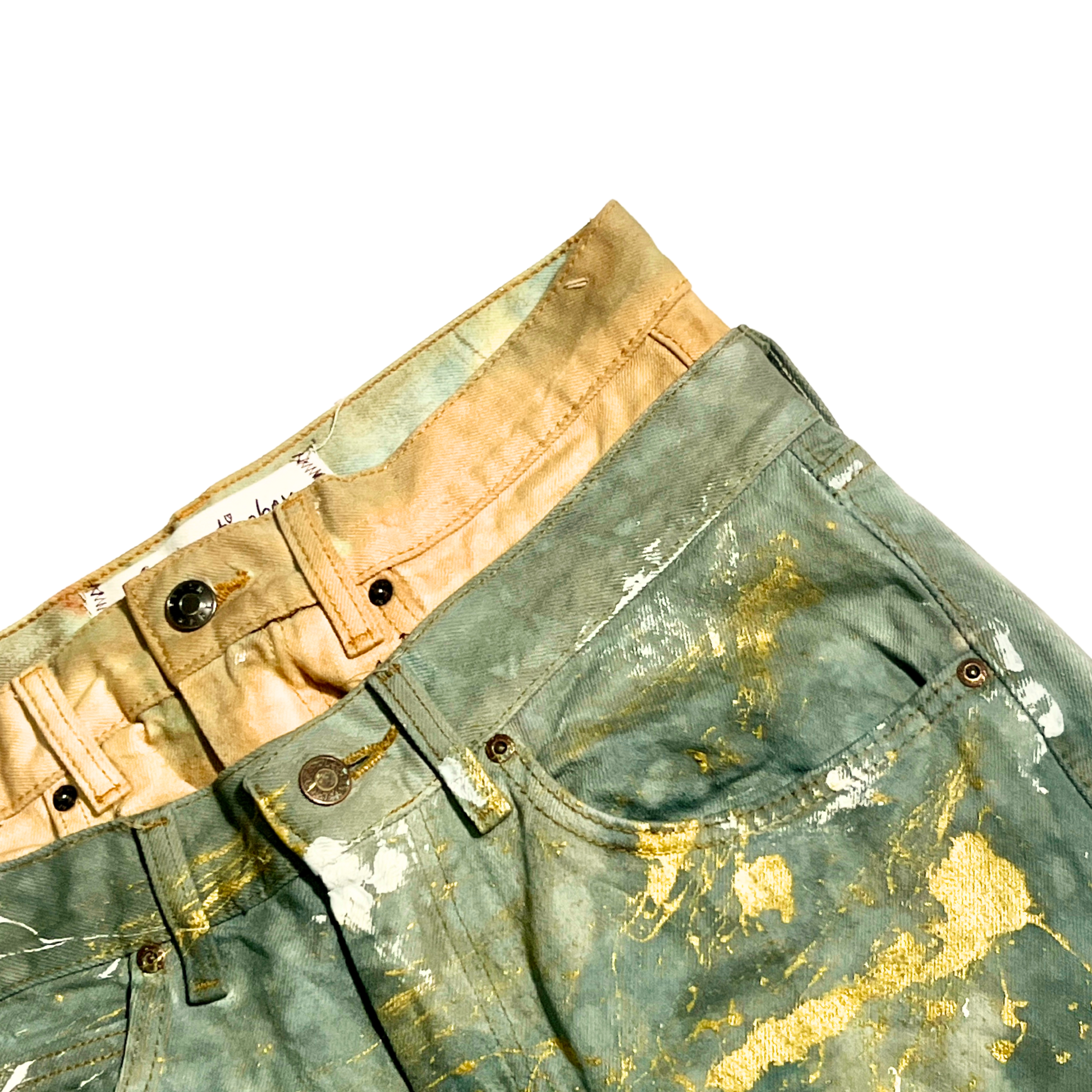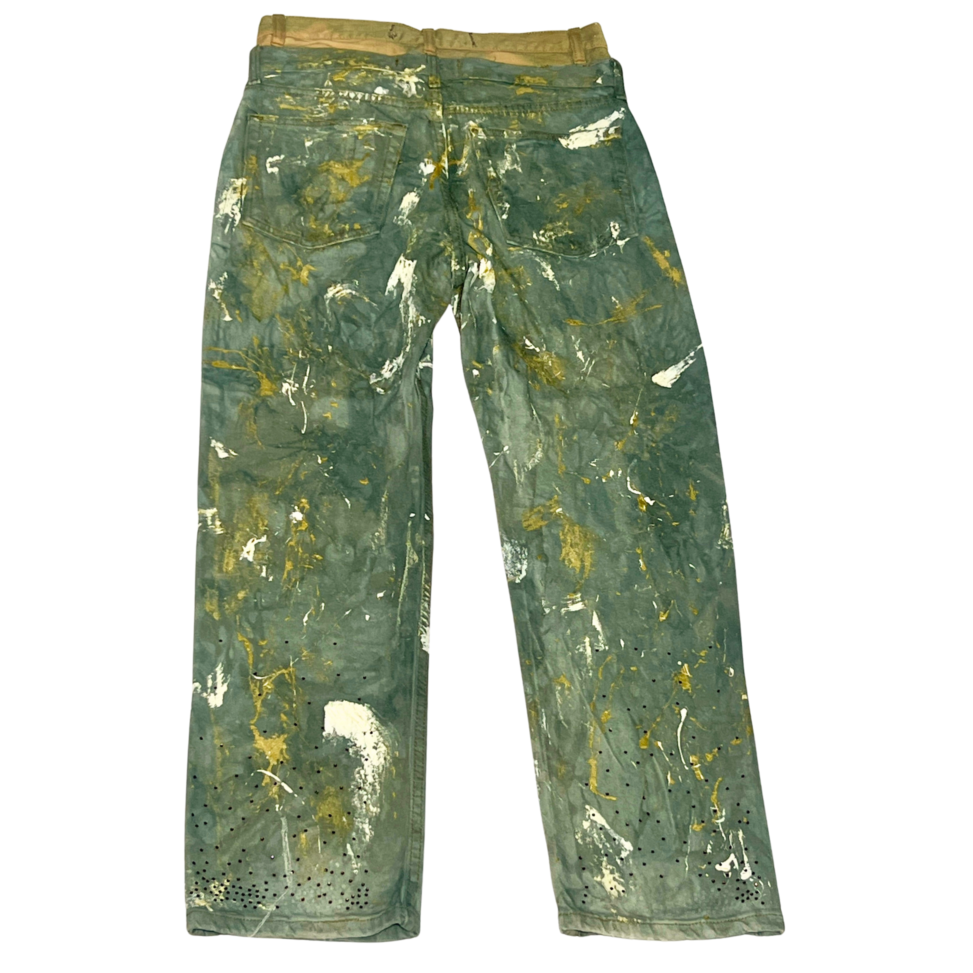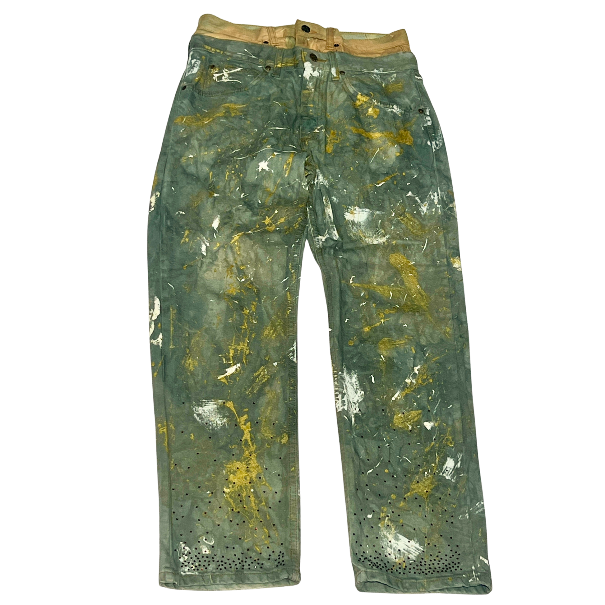 Jeans: Double-waisted structure with paint splatter + rhinestone detailing
