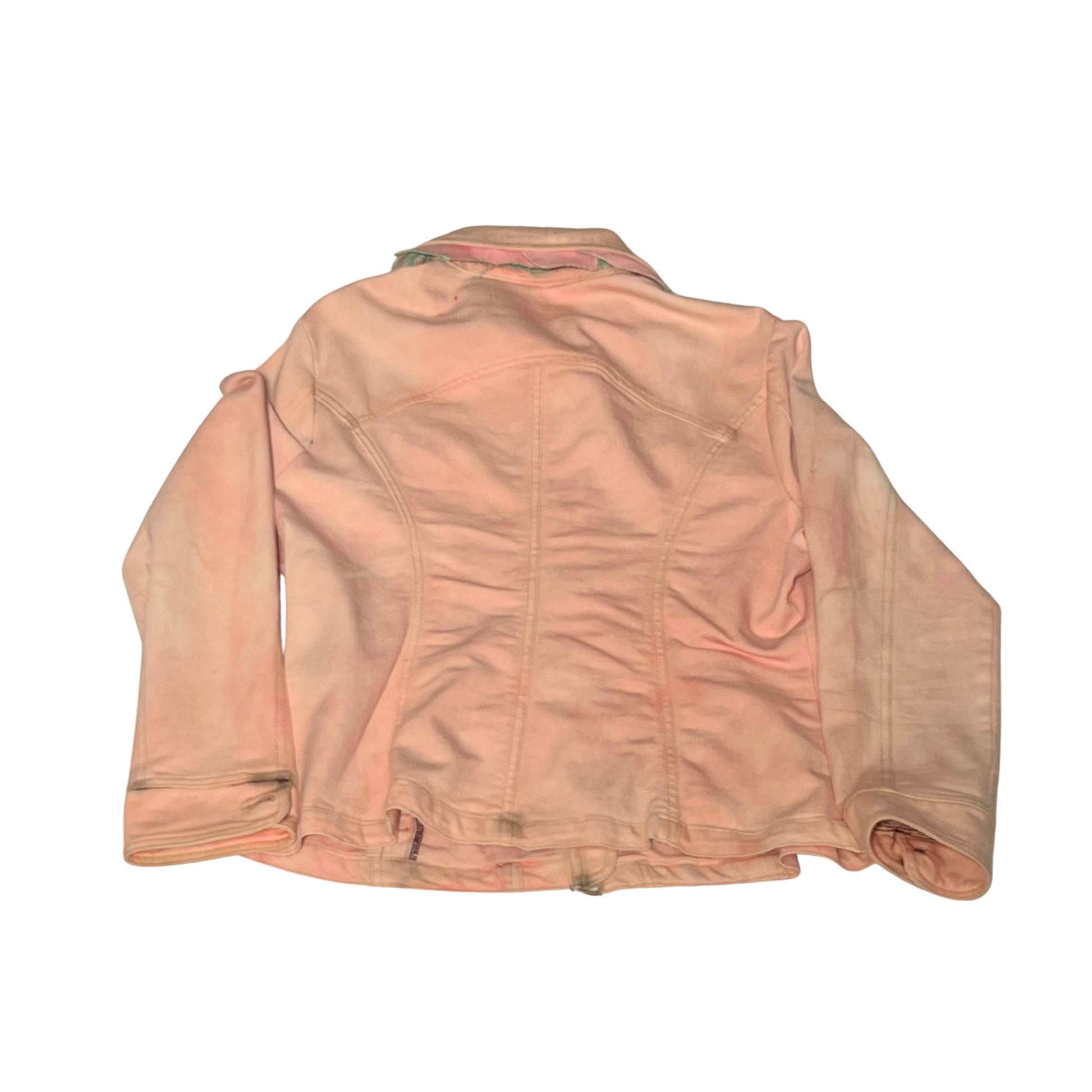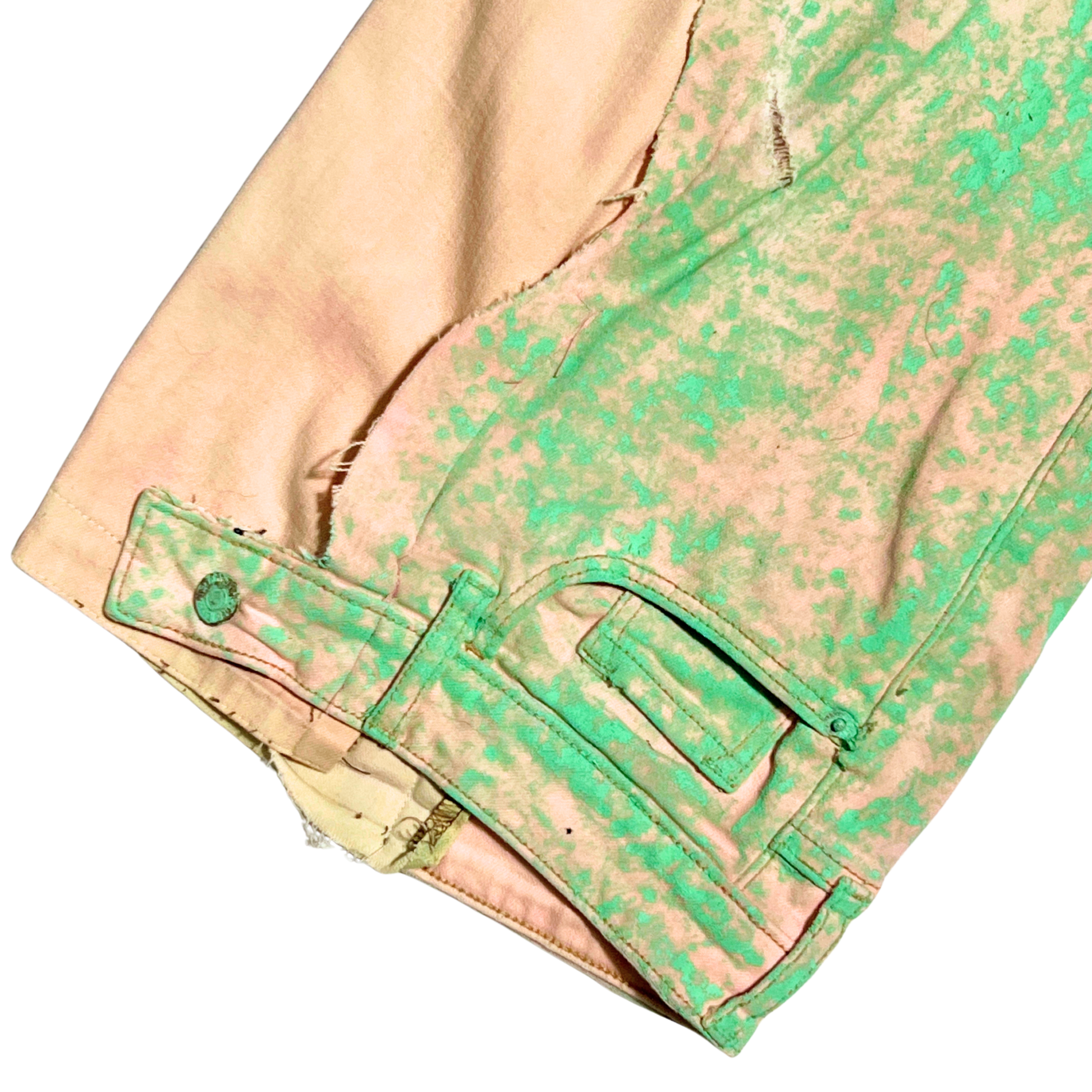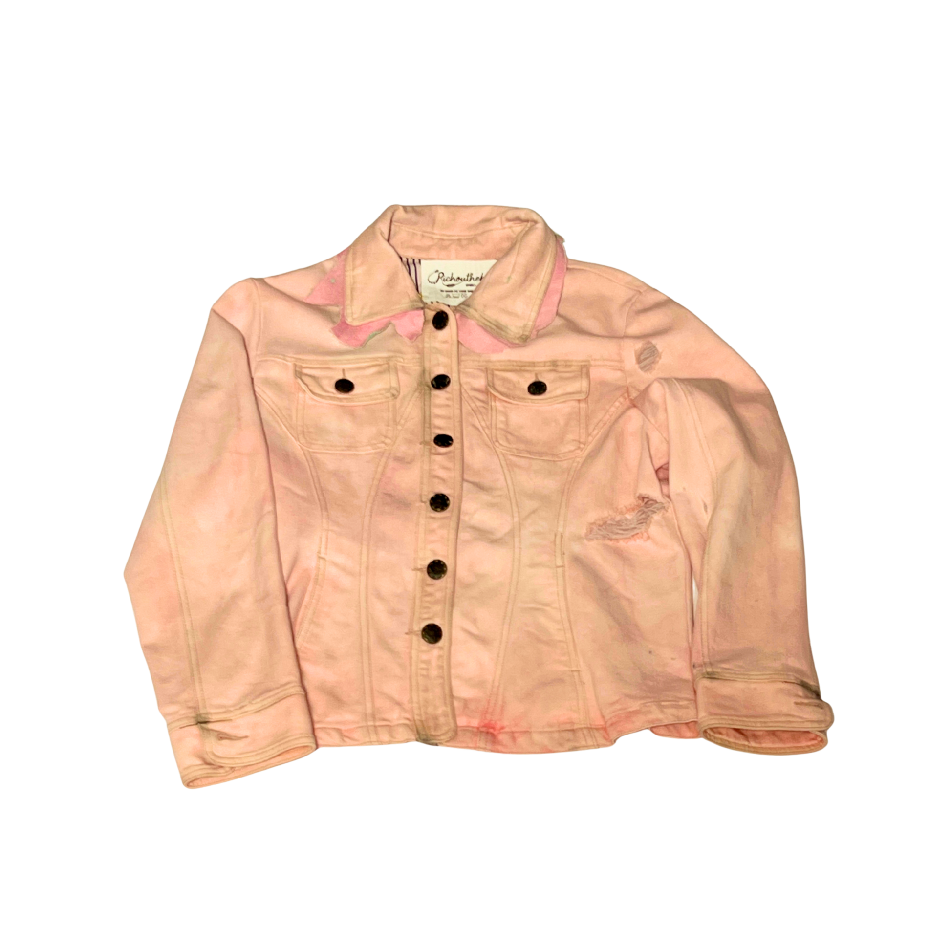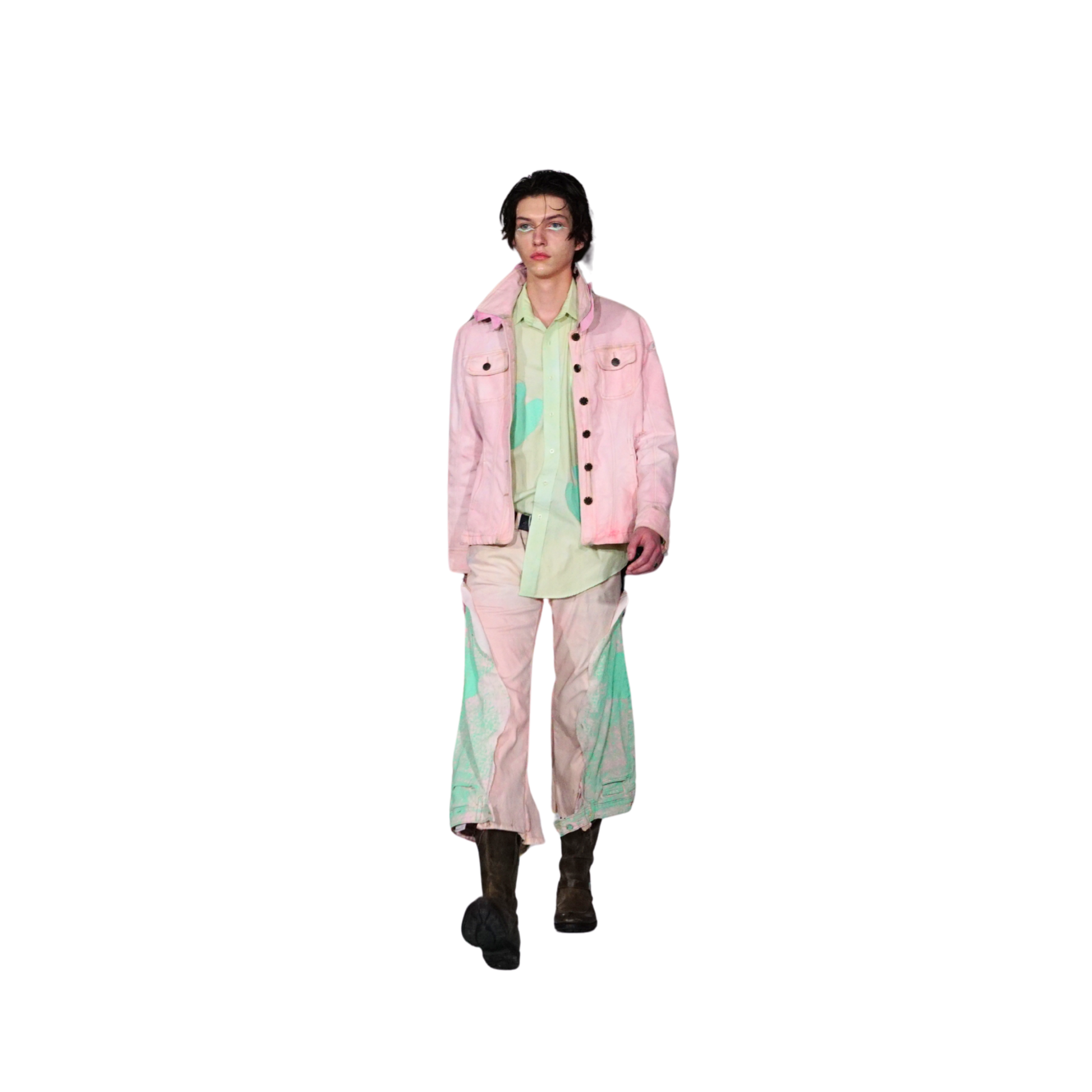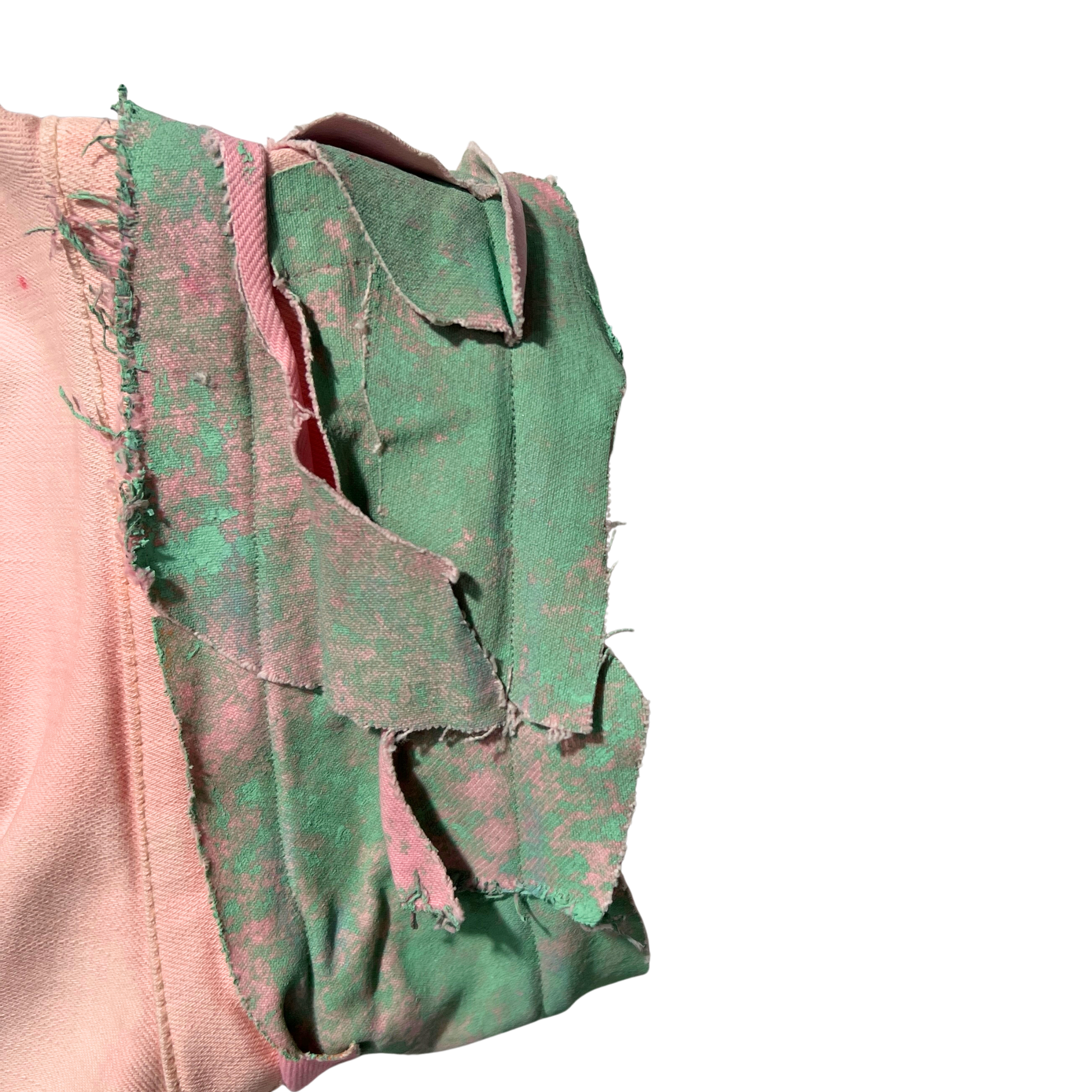 Jacket: Inverted patchwork denim collar, pink and green dye wash, minimal hardware