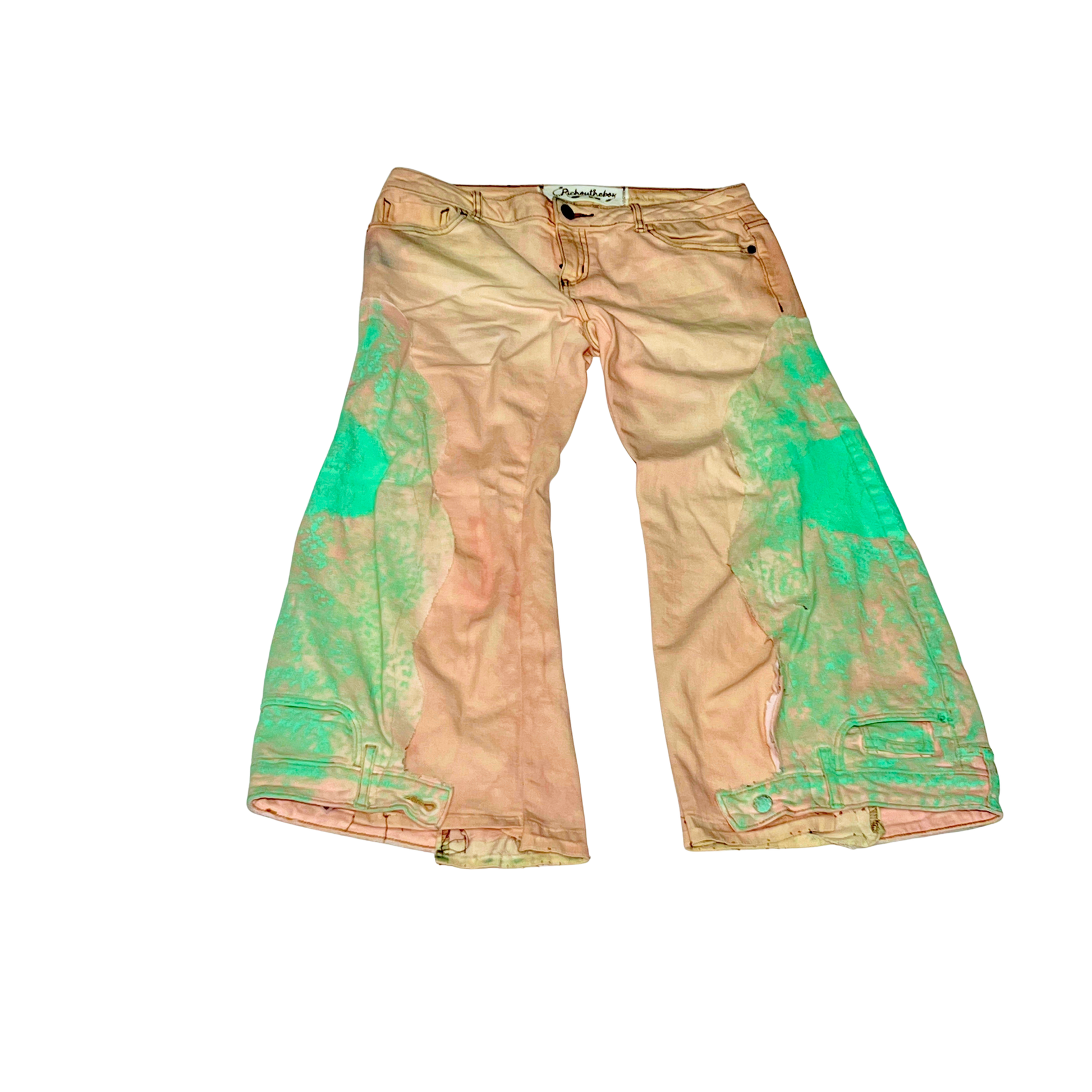 Pants: Outseam flare from flipped donor jeans, dual-wash structure