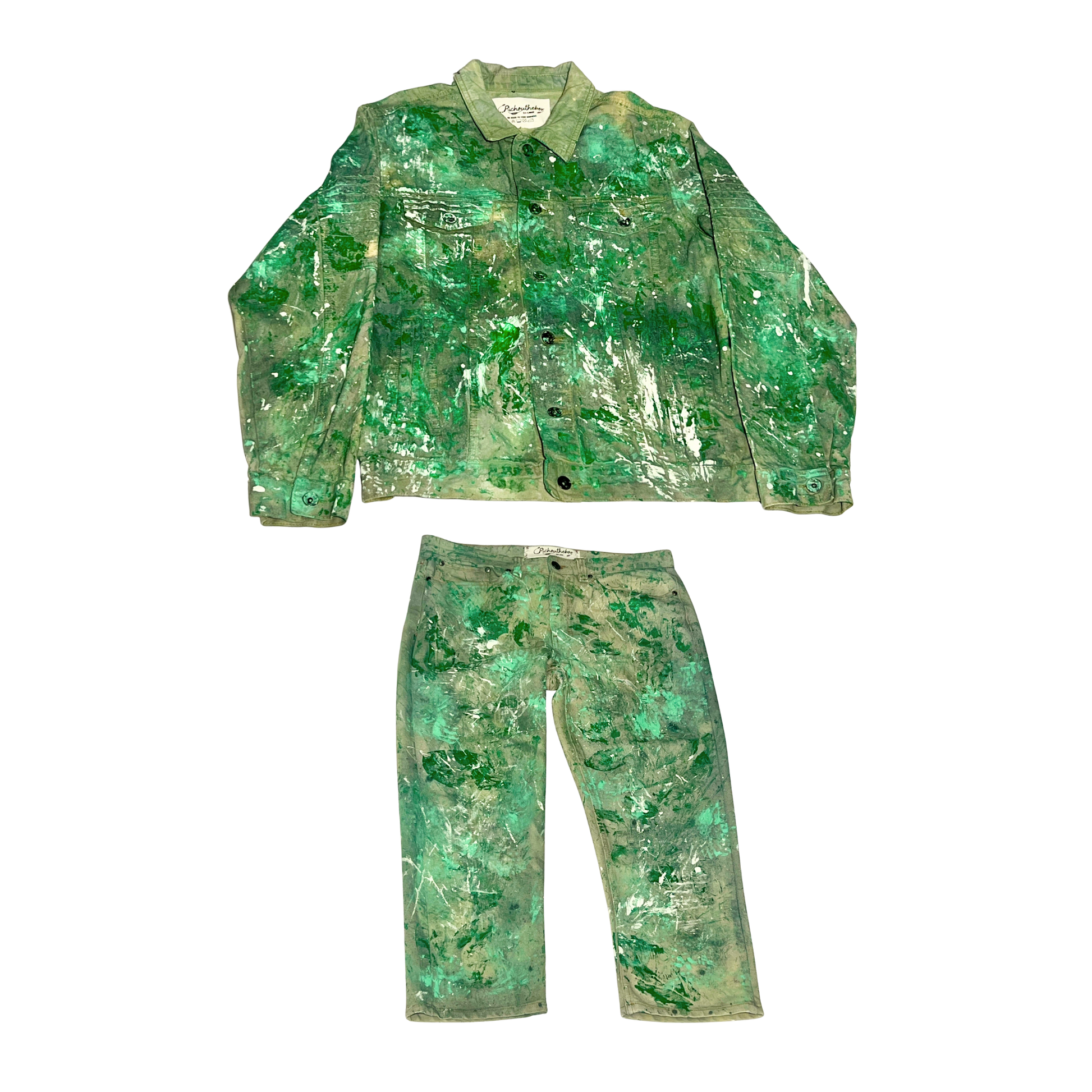 Description: This isn’t your average camo. Blending Out pushes back against sterile digital camouflage by embracing the chaos and calm of real nature. Created through a hands-on, fully organic process, this look was crafted using fallen leaves and sticks collected on a nature walk. Each imprint was made by hand using layers of green ink and acrylic paint, forming a one-of-a-kind forest-inspired print across both the jacket and jorts. A tribute to the designer’s father — who has worked in the wholesale tree industry his entire life — this piece reflects how roots, craft, and creativity intertwine. Upcycled | Hand-Stamped | Nature-Printed | Dry Clean Only