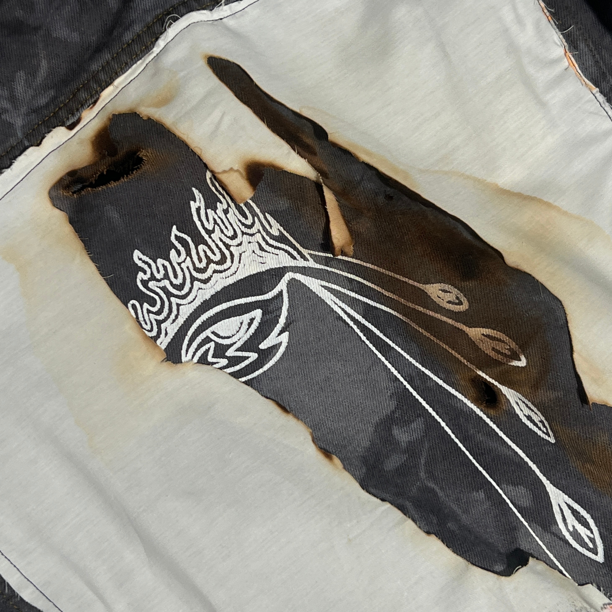 This denim set was constructed using flame appliqués and controlled burning as the primary fabric manipulation techniques. The jacket features flame appliqués on the front pockets and a triple-layered back panel: a "fire eye" print, topped with a scorched white overlay and finished with a large flame applique for dimension and depth.