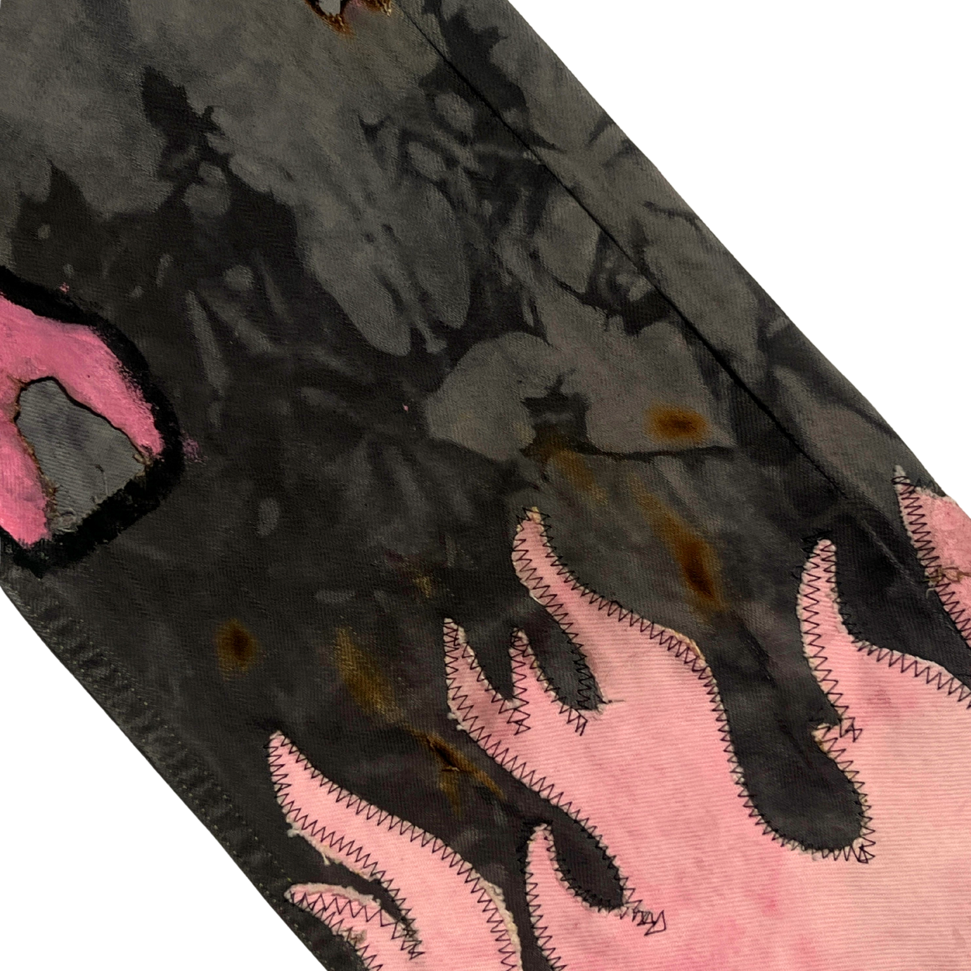 Pants: Burnt details with pink flame overlays, hem appliqués
