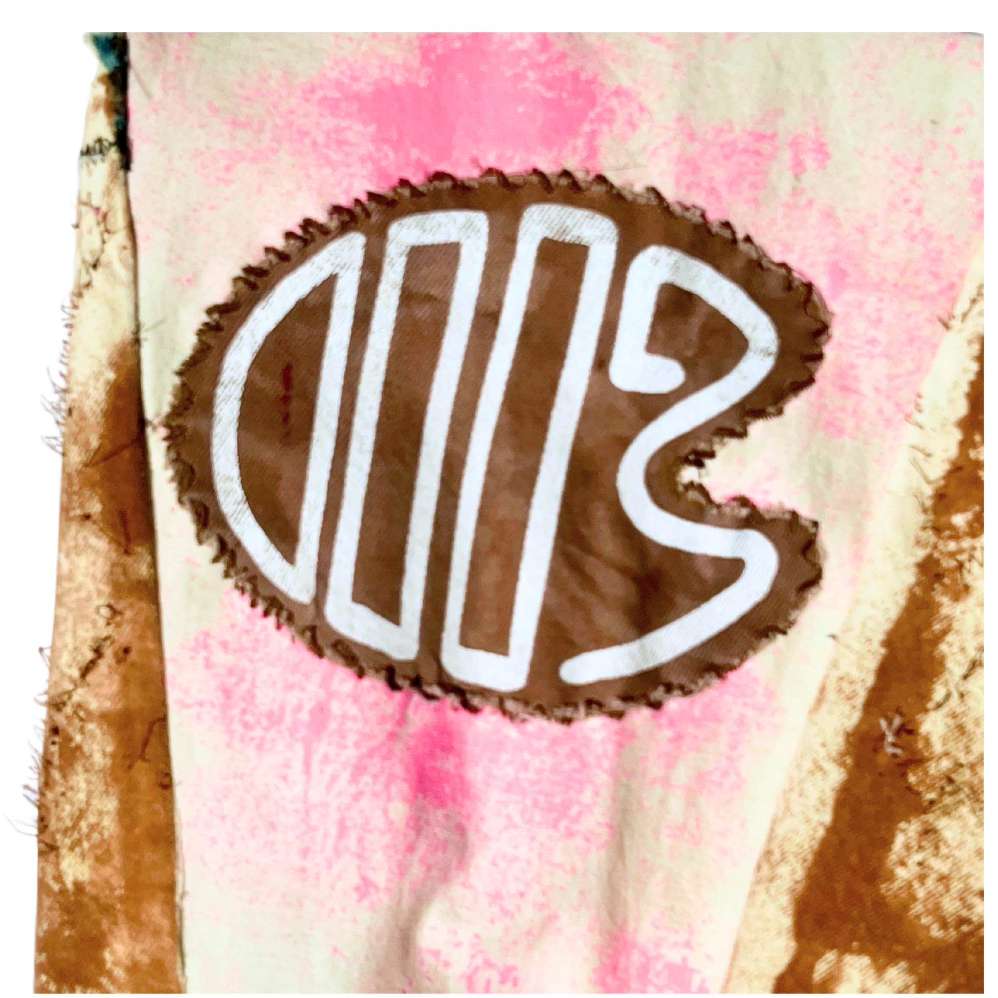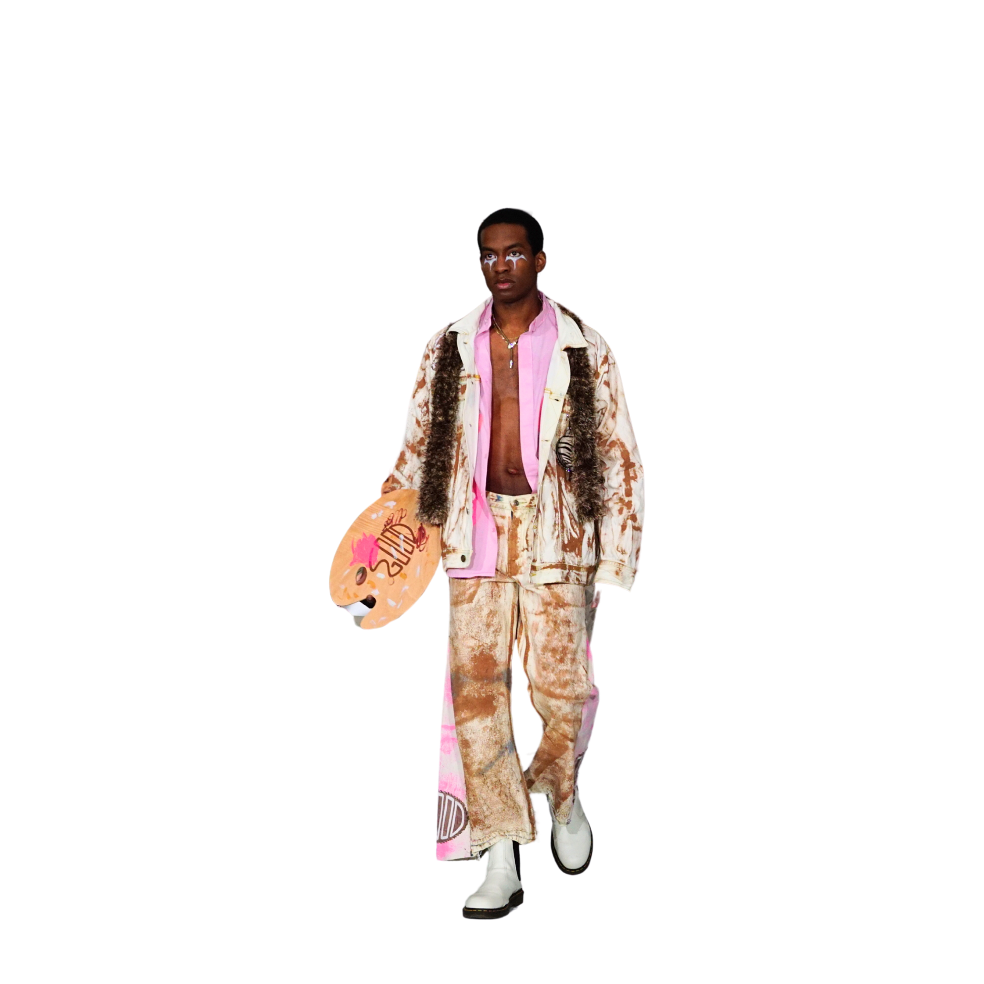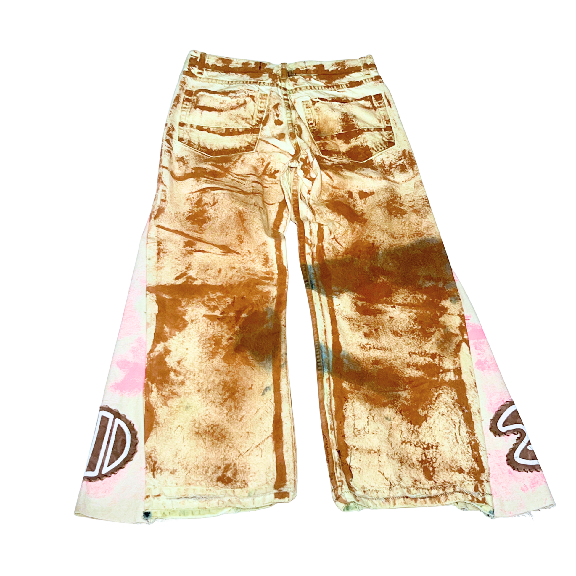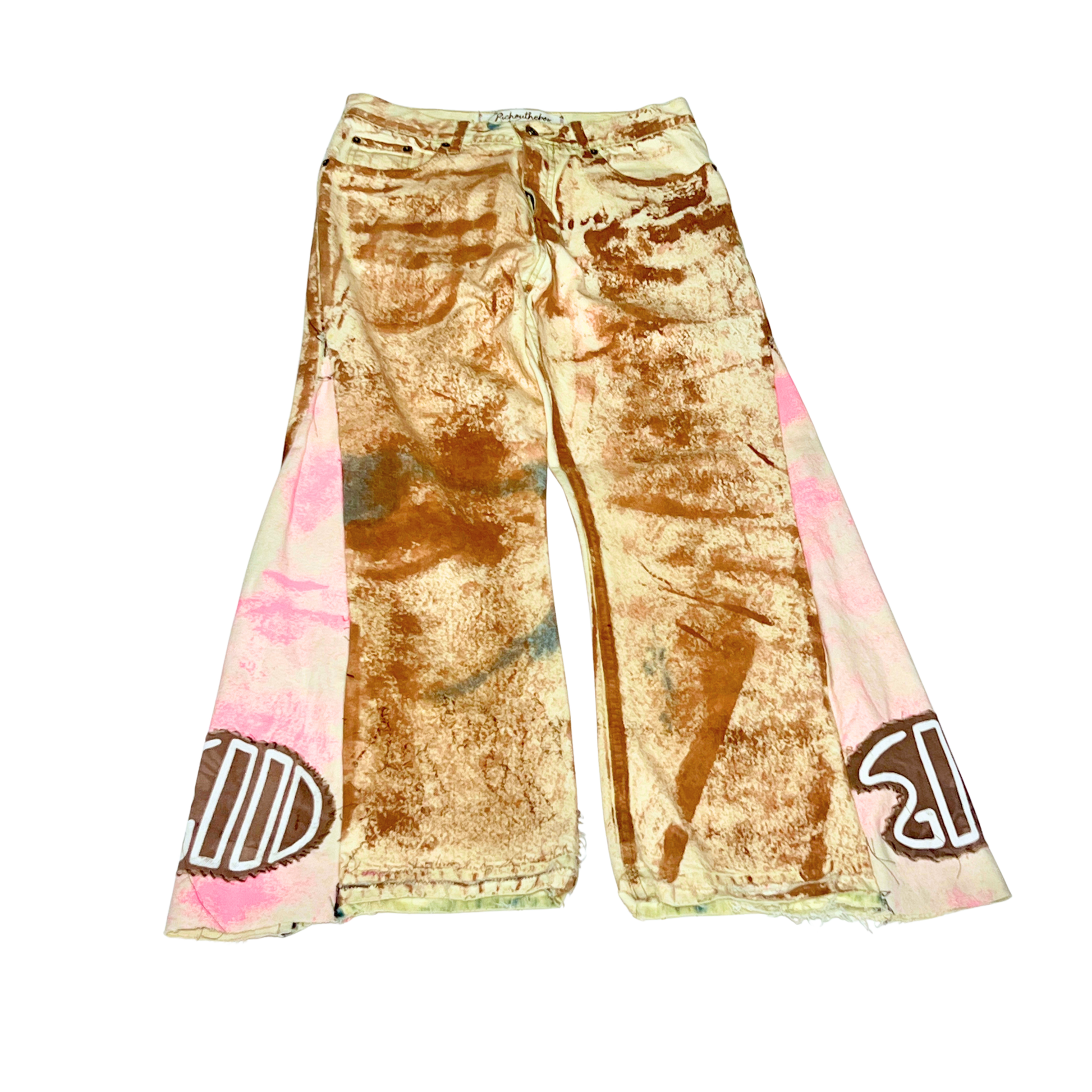 Pants: Dual-panel flare with embroidered palette patch, paint texture throughout