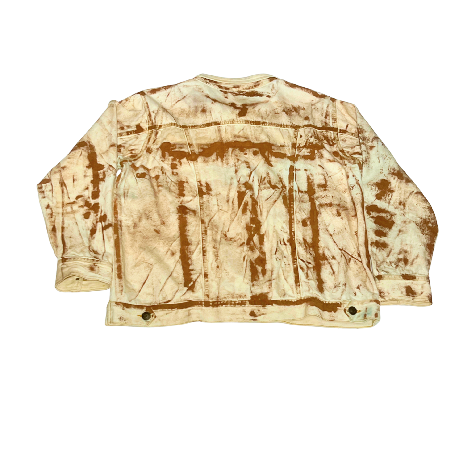 White denim set using rolled paint technique to create a textured, blotchy finish. The embroidered “GOOD painter’s palette” patches on both the jacket and pant flare echo the energy of an art studio where expression takes priority over precision.