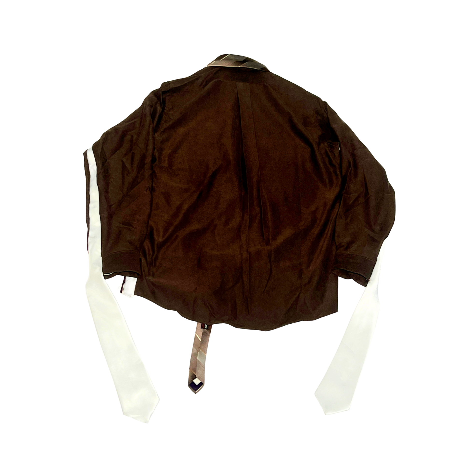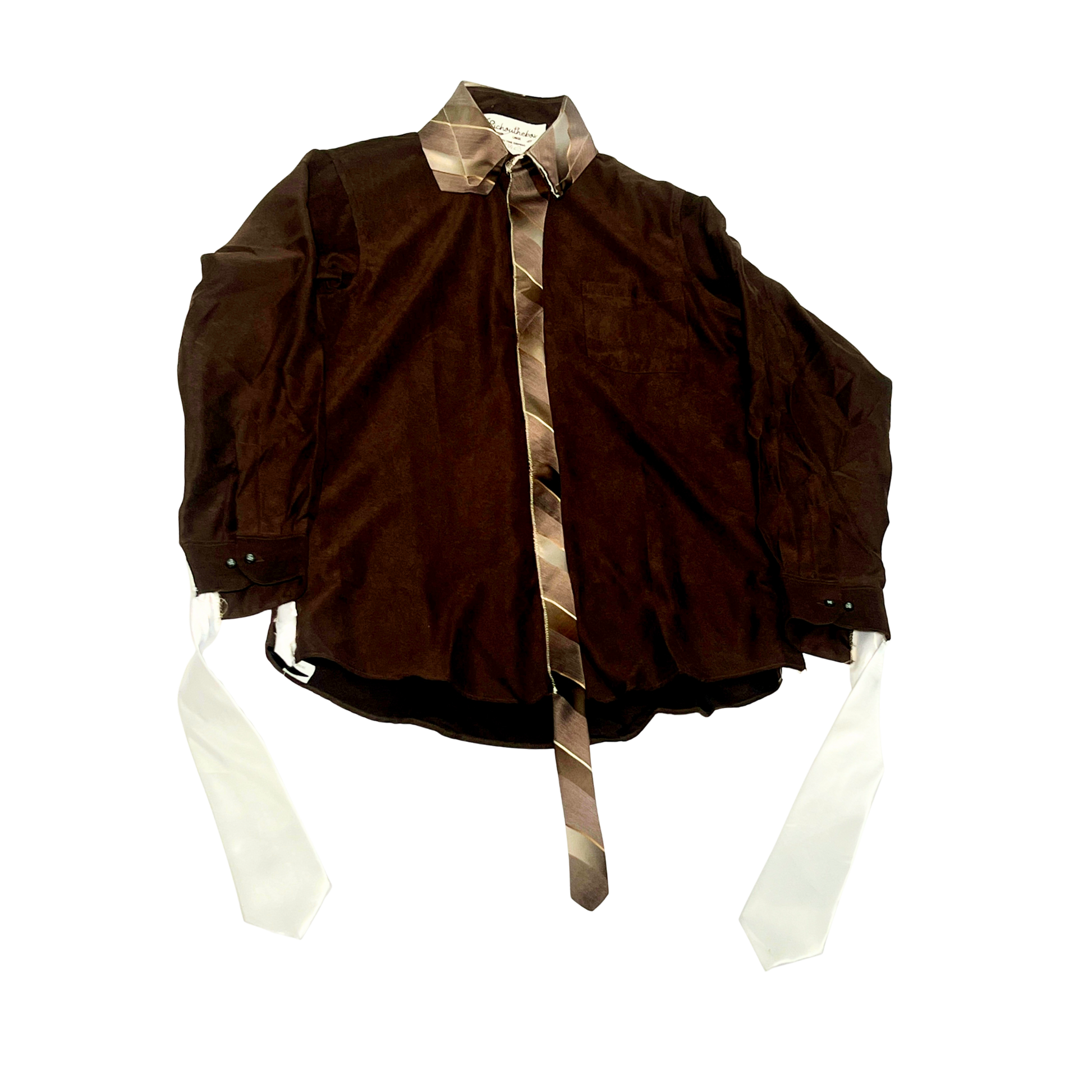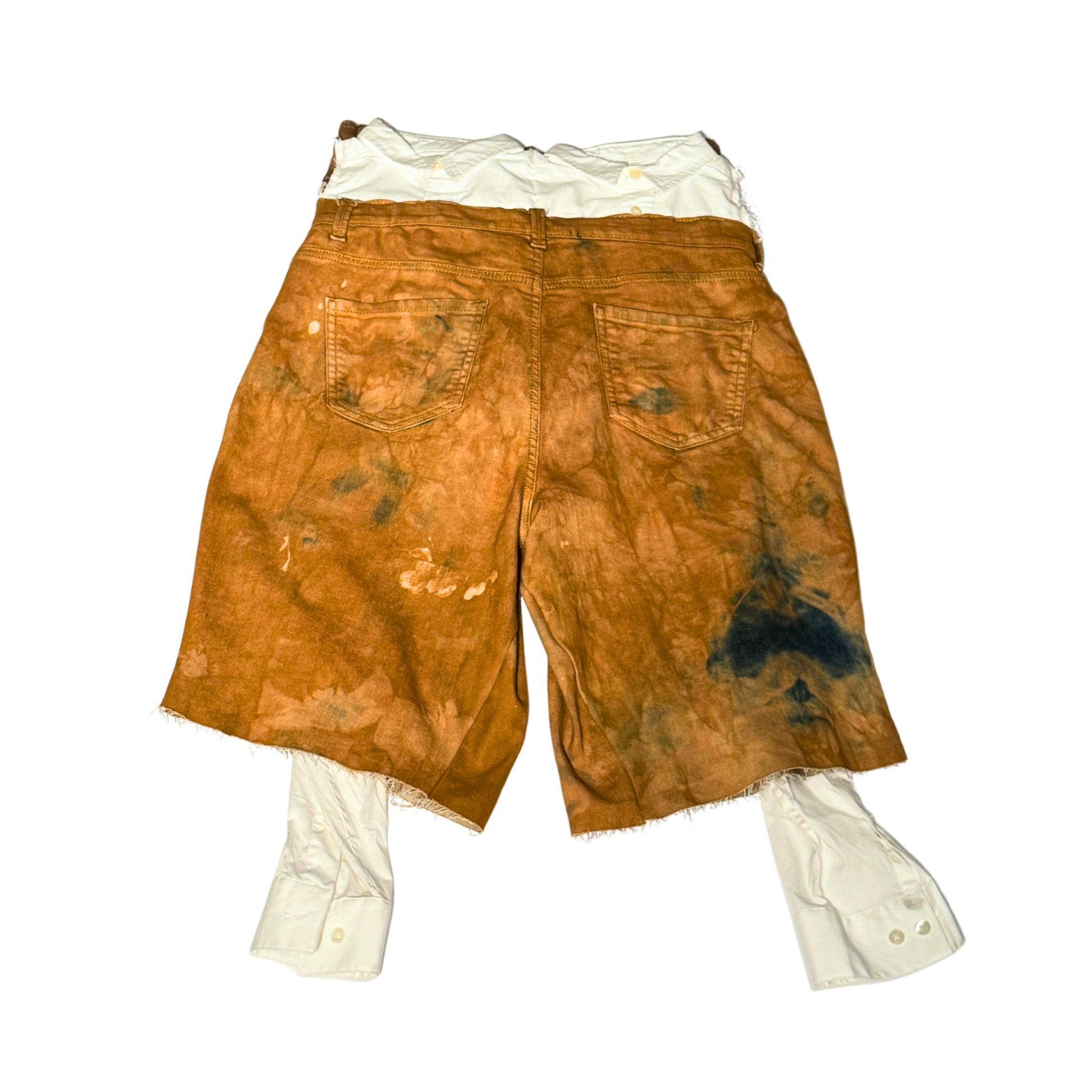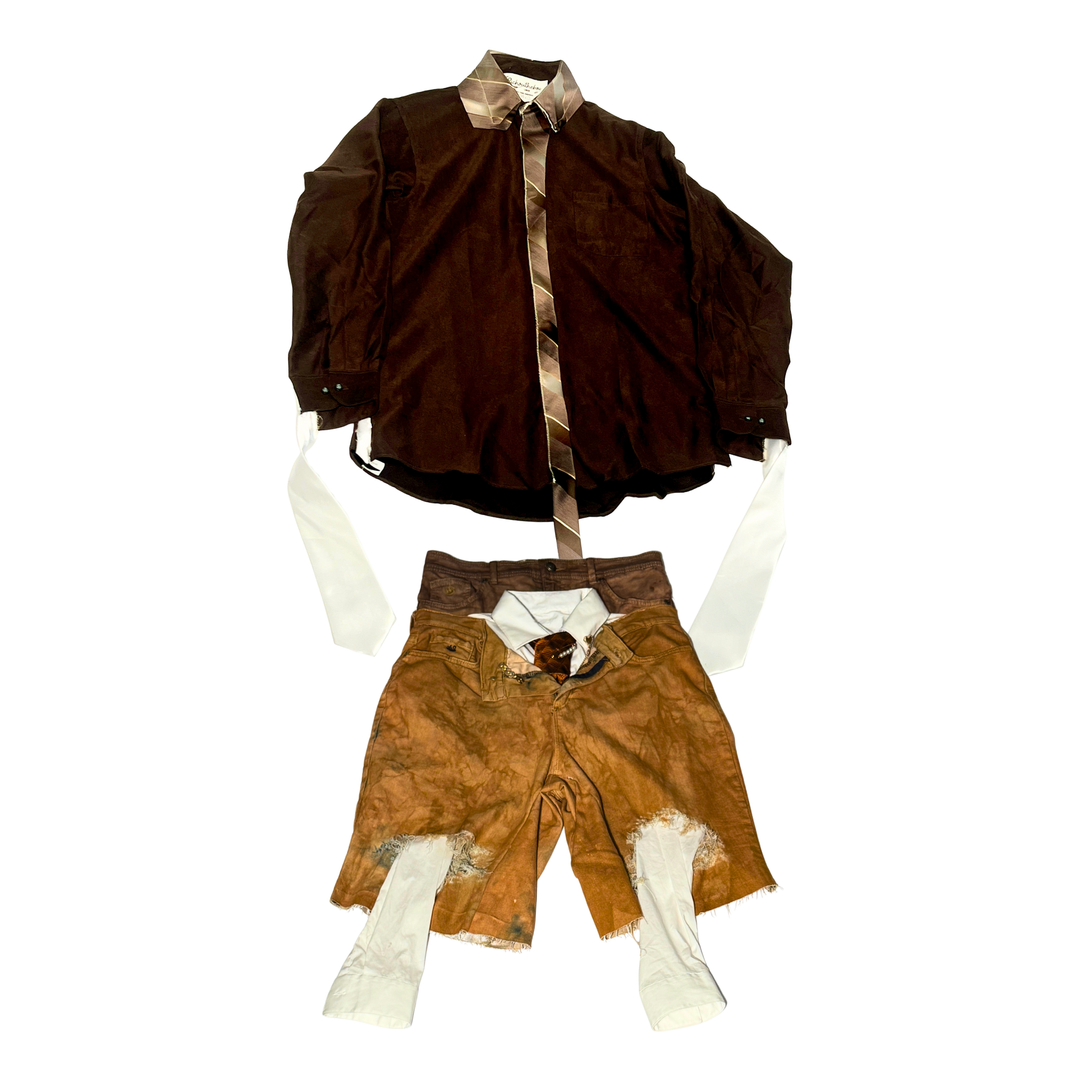Process: I cut open the button-up to add ties at the sideseam and along the arms. I then add a tie detail to the collar and as a button cover. As for the paints, I sewed the dress tees between the top and bottom layer of jeans and added the tie.