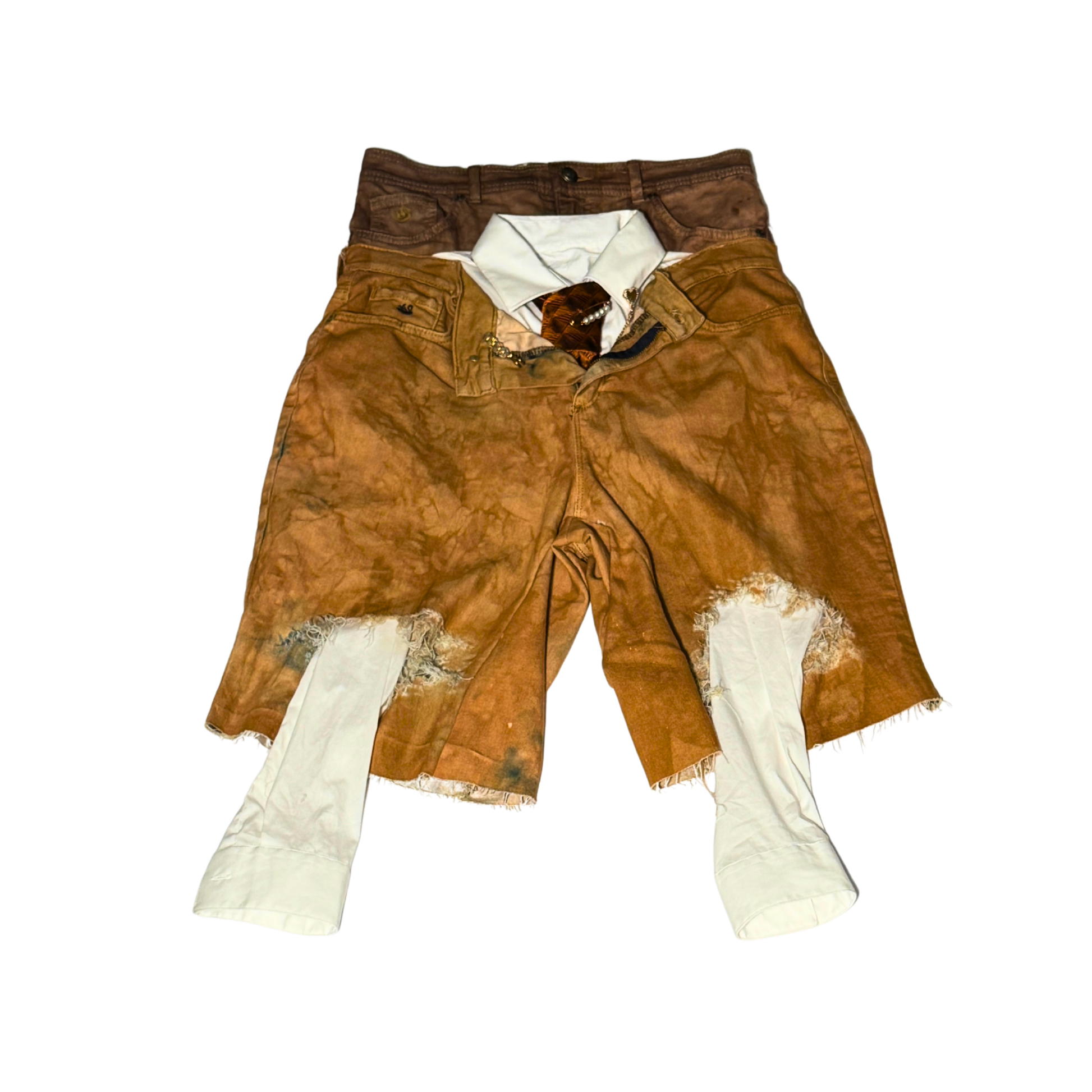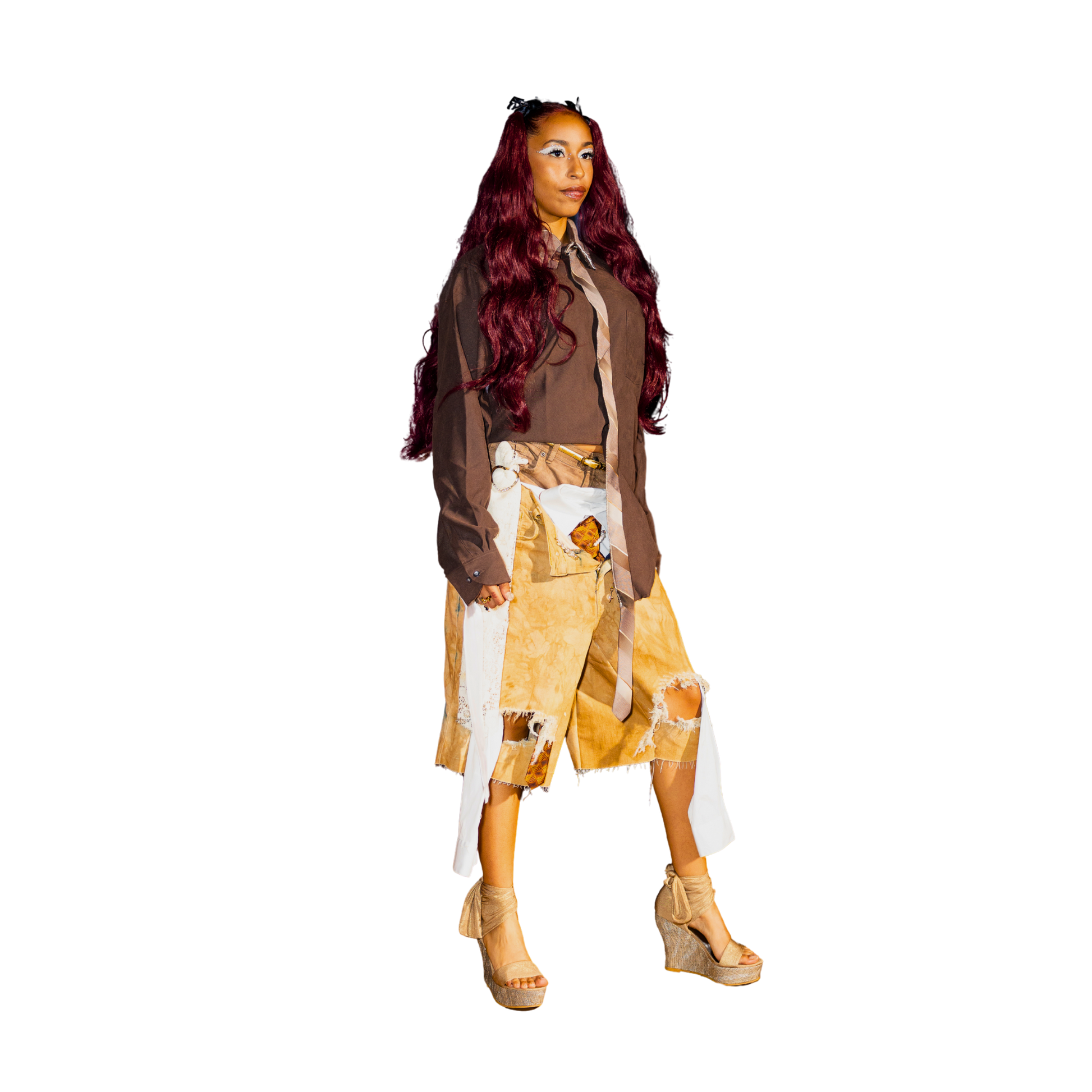 Description: This look features a button-up that has three ties incorporated into the top, a red floral corset. The double-waisted jorts are not to be overlooked. There is a dress tee with a tie between the layers and 2 mini dress tees in the back of the pants.