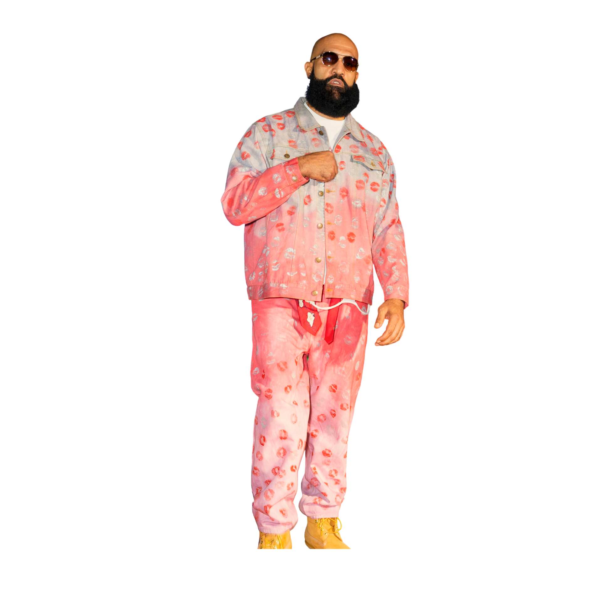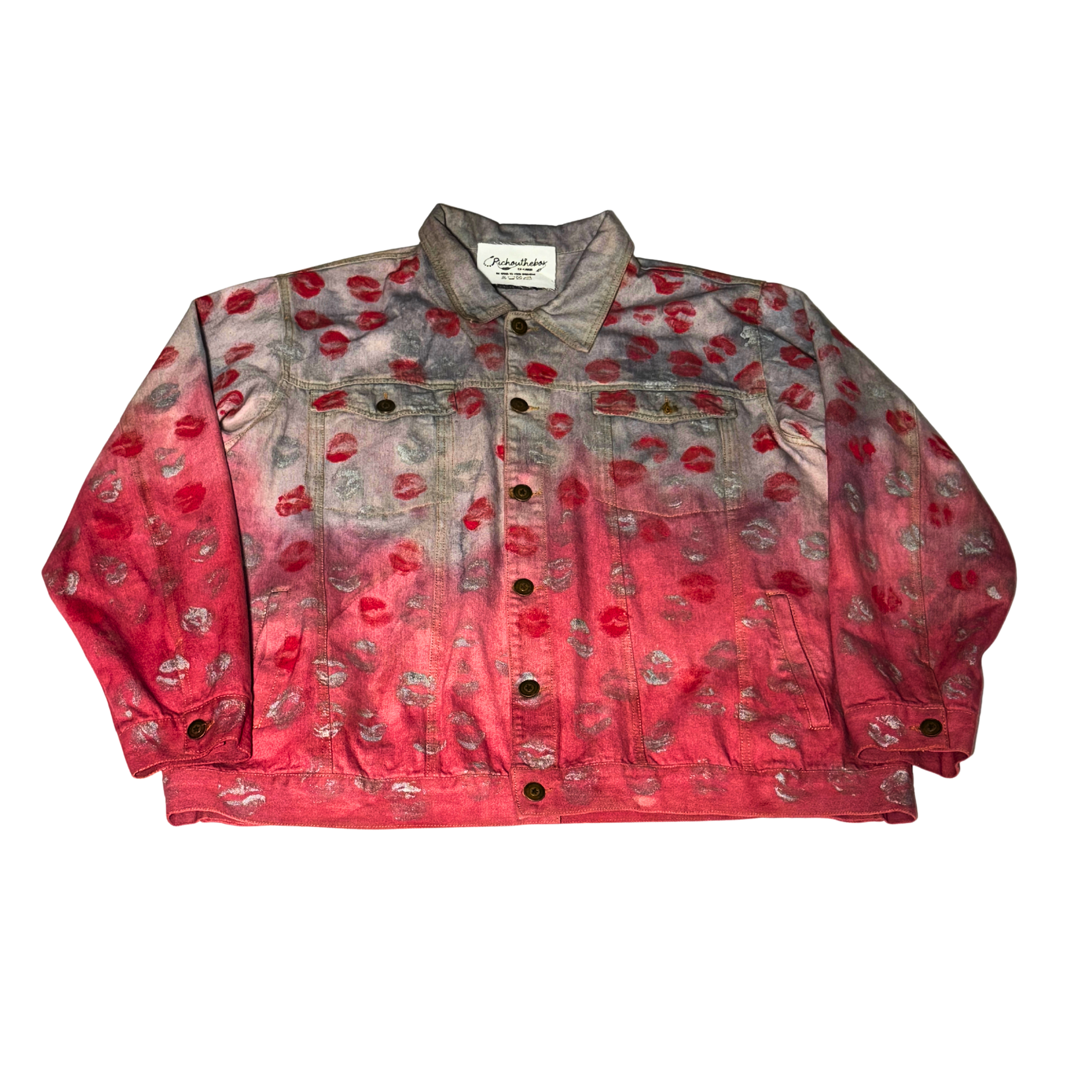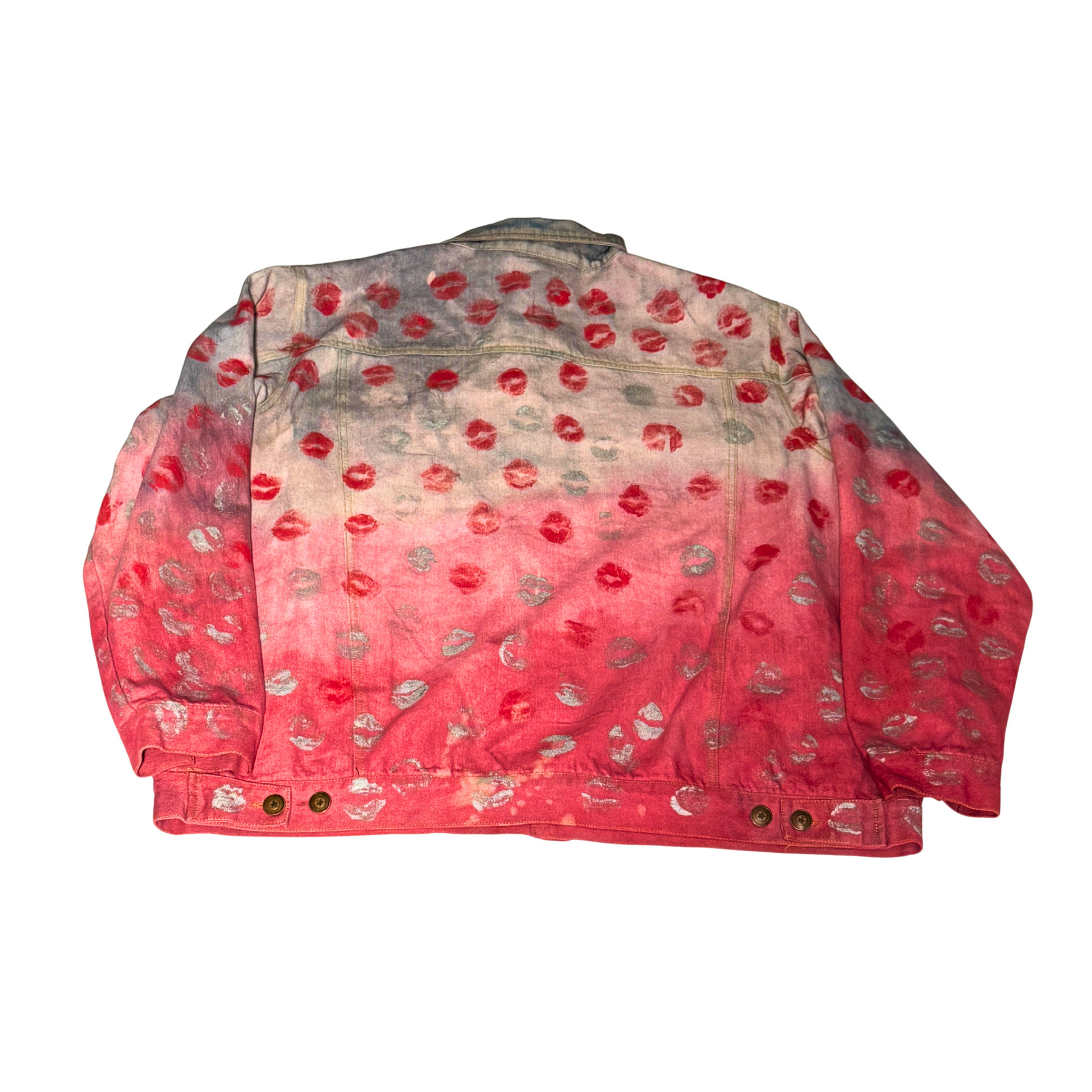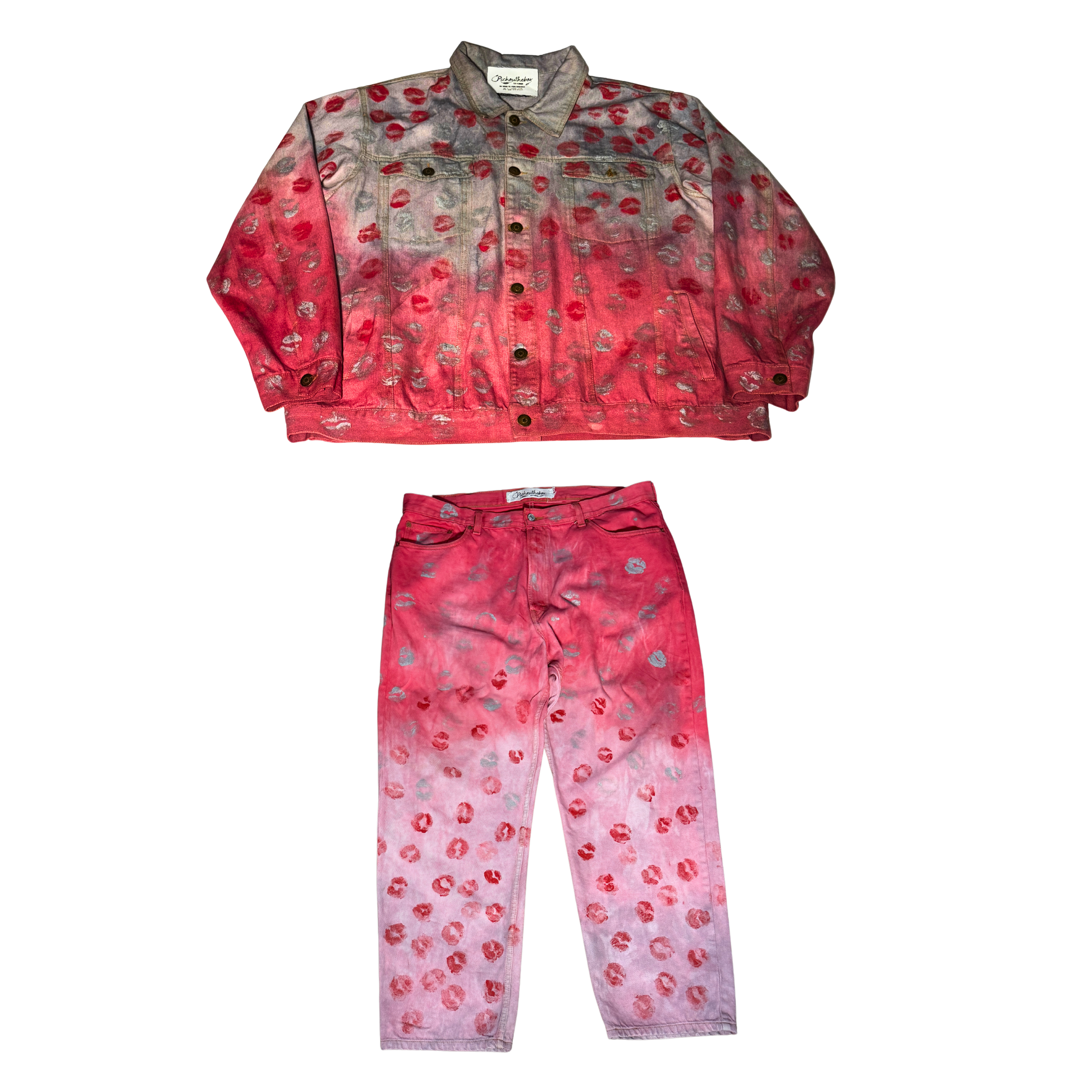 Process: The denim was treated with our proprietary ombré dye technique, building gradient movement across the full set. The designer then painted his lips with ink and pressed kiss marks across both garments to offset the dye work and introduce a tactile, symbolic layer of LOVE. 1 of 1 | Never Recreated